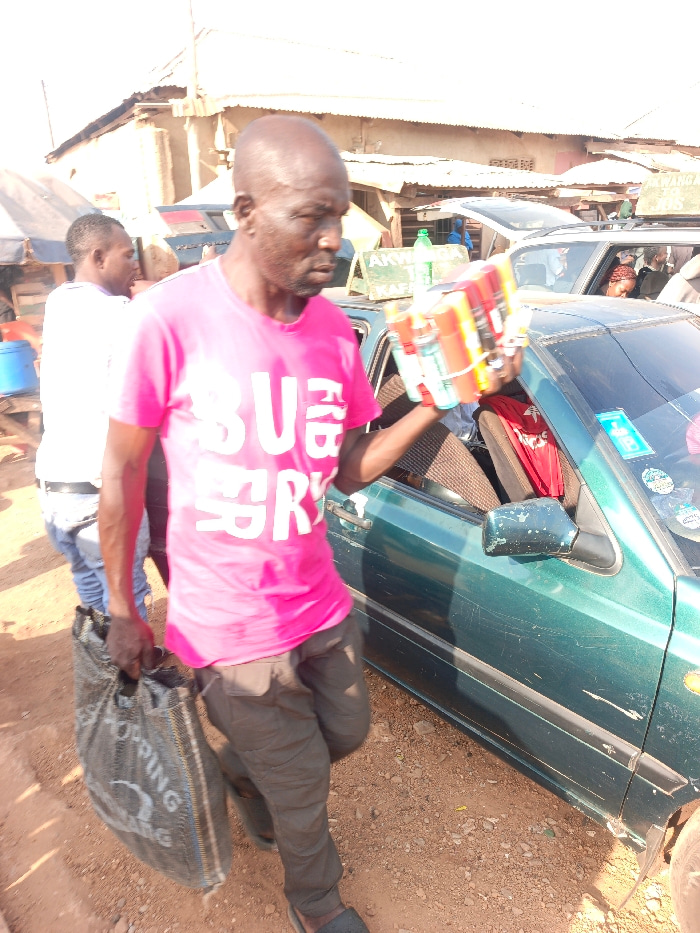 The scene depicts an outdoor, unpaved area in Akwanga, Nigeria, characterized by reddish-brown dirt and gravel ground. A prominent green and white sign in the background clearly displays "AKWANGA" andβ¦read more