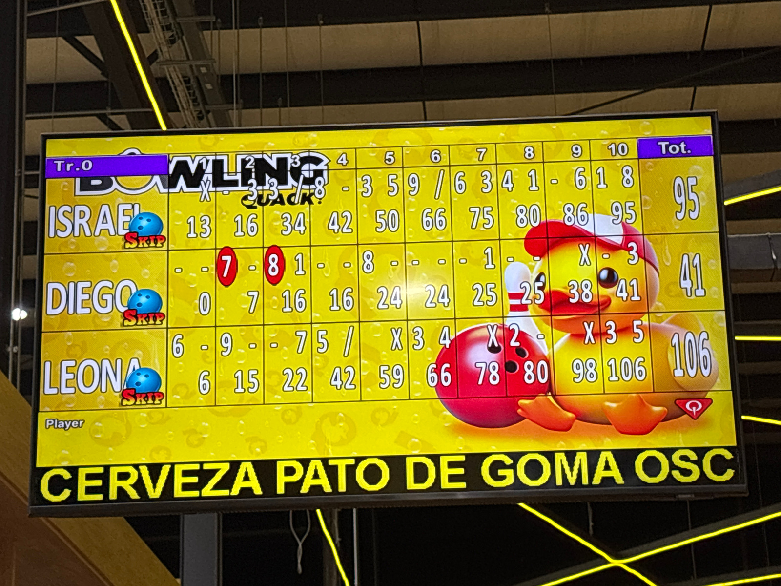 The image shows a bowling scoreboard, indicating a game in progress. The scoreboard displays scores for three players: ISRAEL (95), DIEGO (41), and LEONA (106). Each player's score is broken down by f…read more