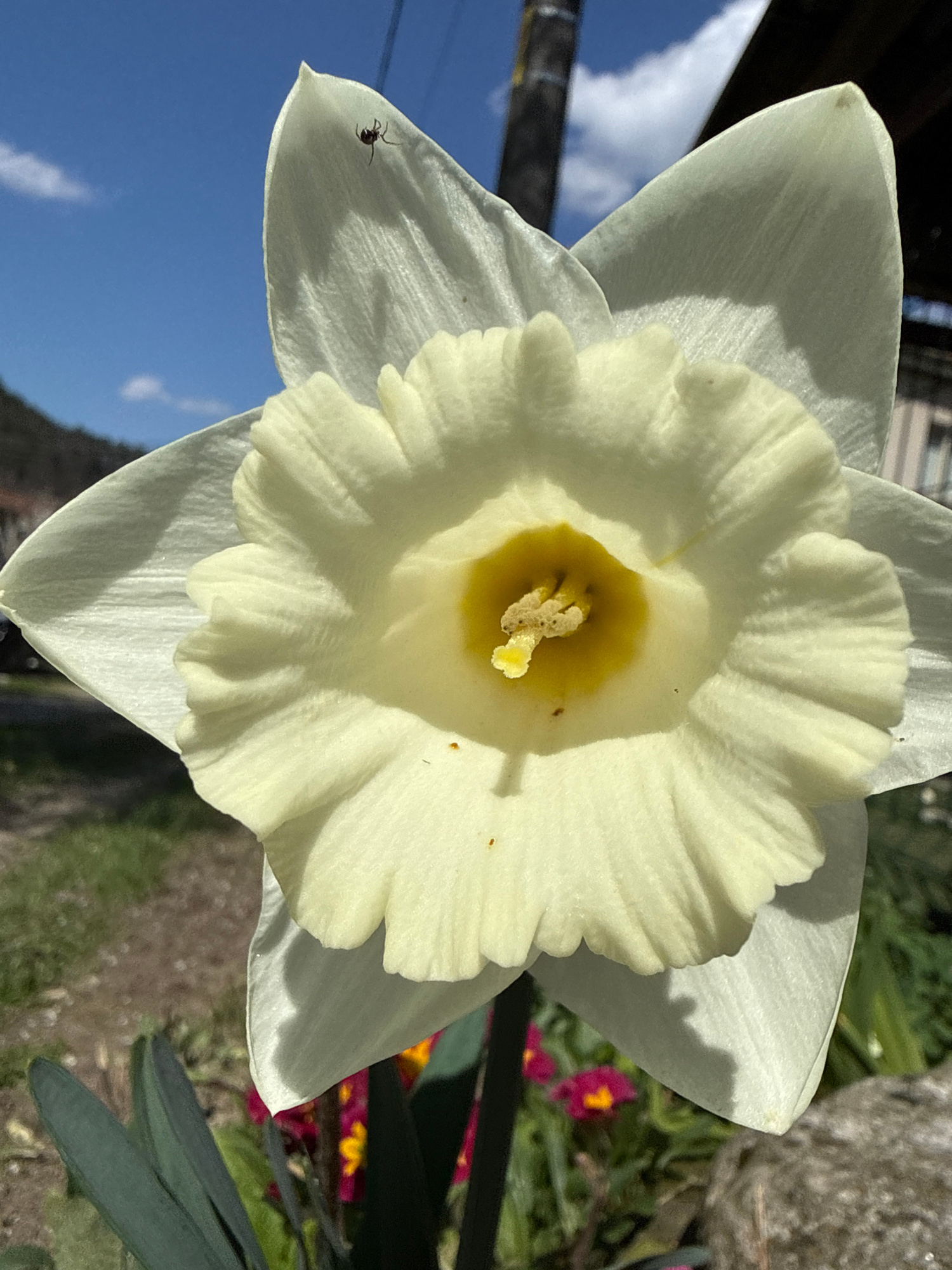 A close-up photograph captures a white daffodil flower, its petals fully open to reveal a yellow center. An ant is visible on one of the petals. The background includes a blue sky, greenery, and hints…read more