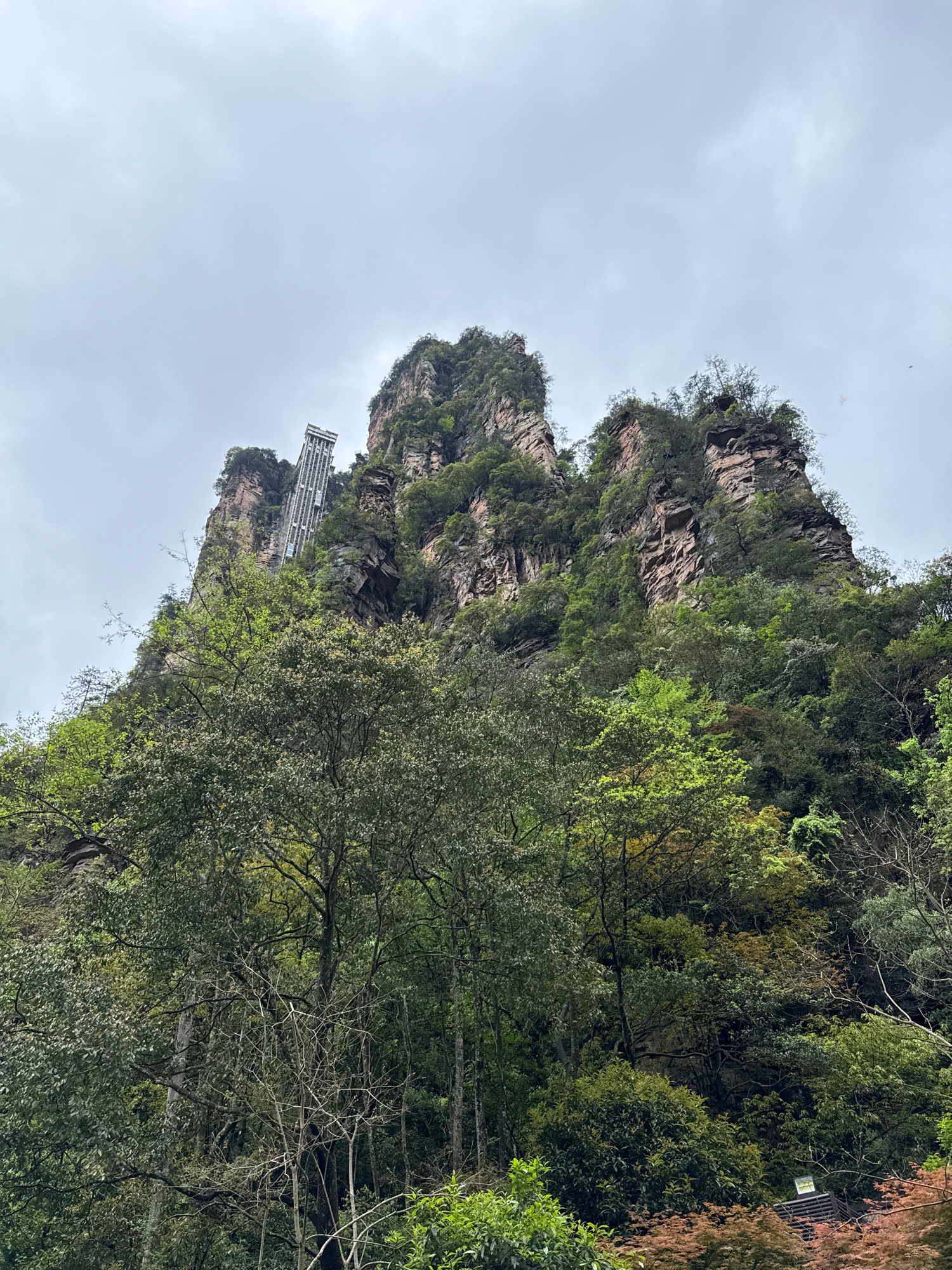 The image depicts a steep, rocky cliff face covered with dense green vegetation in Luoguta, China. A tall, slender structure, likely an elevator or observation tower, is built directly into the cliff.…read more