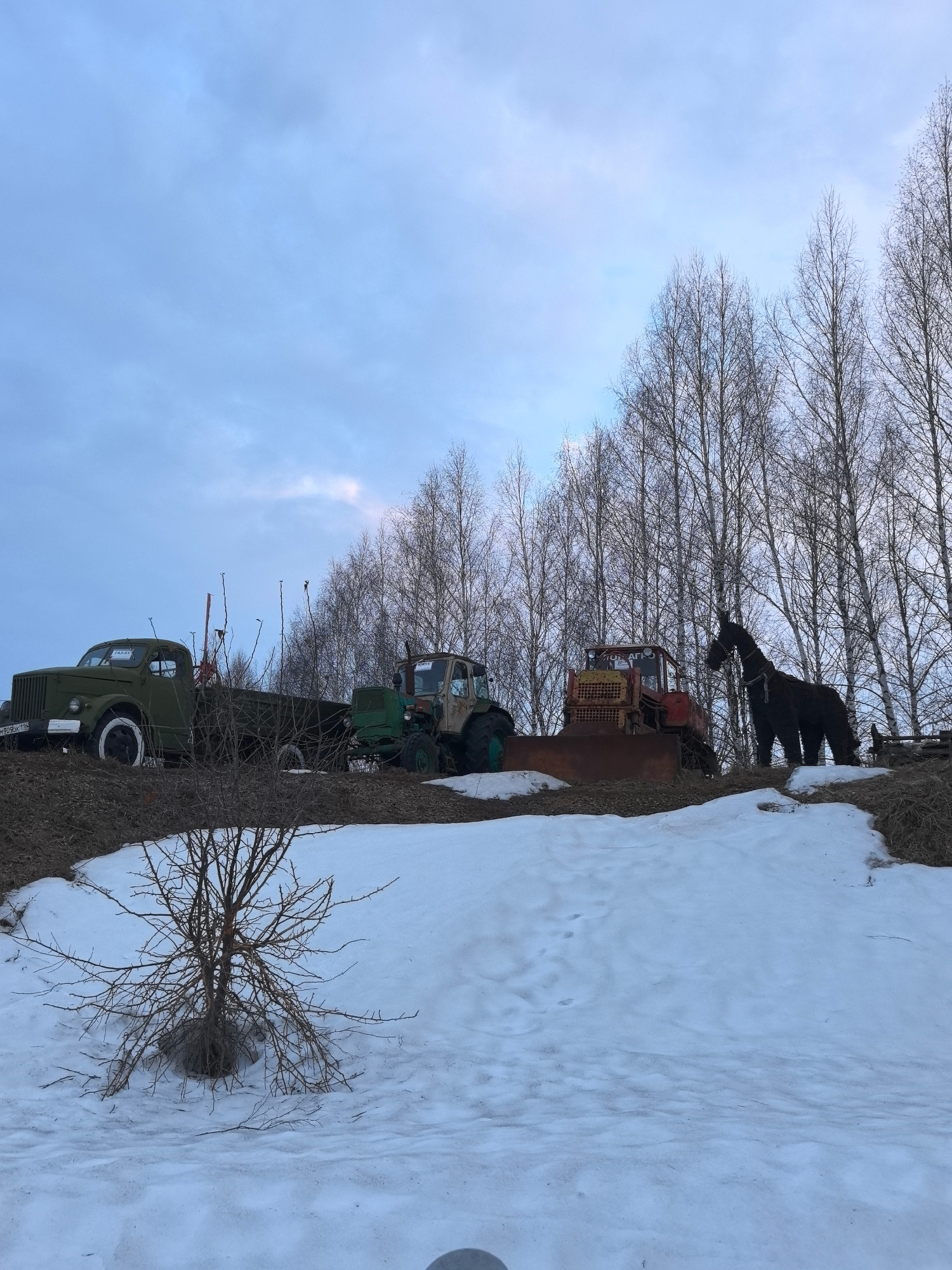 The image depicts a snowy landscape in Bol'shoi Mashlyak, Russia, with several vehicles and a horse statue positioned on a low hill against a backdrop of bare trees and a cloudy sky. From left to righ…read more
