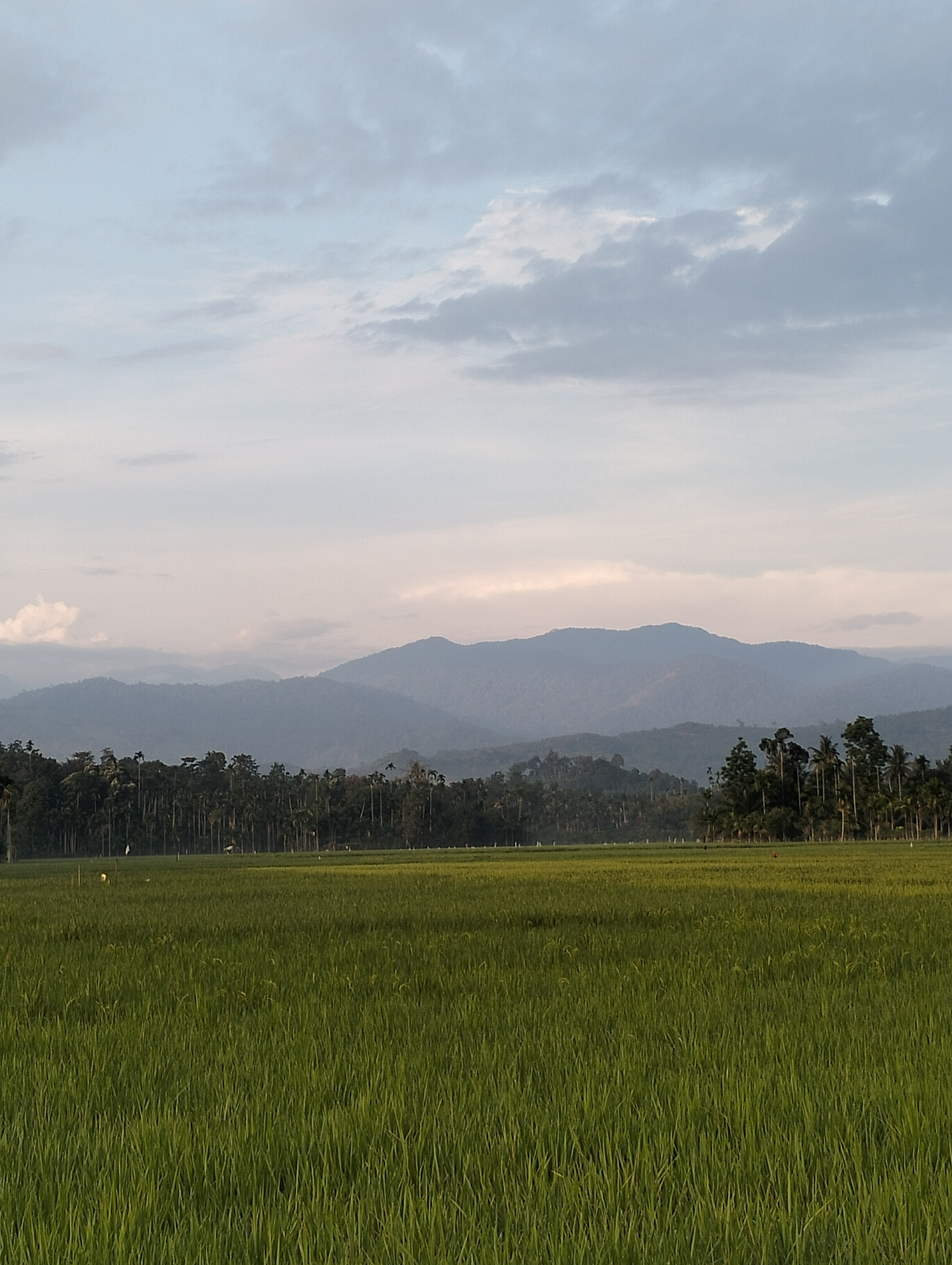 The image shows a wide, green rice field under a cloudy sky in Meunasahalue, Indonesia. In the background, there are mountains and a row of tall, thin trees.