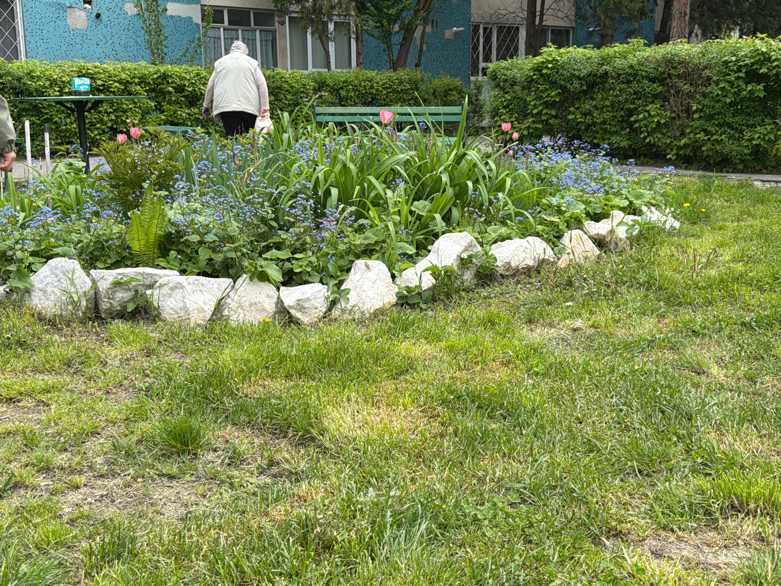 The image shows a flowerbed bordered by large white stones, filled with various plants including forget-me-nots, tulips, and ferns. Behind the flowerbed is a green bench, a trimmed hedge, and a buildi…read more