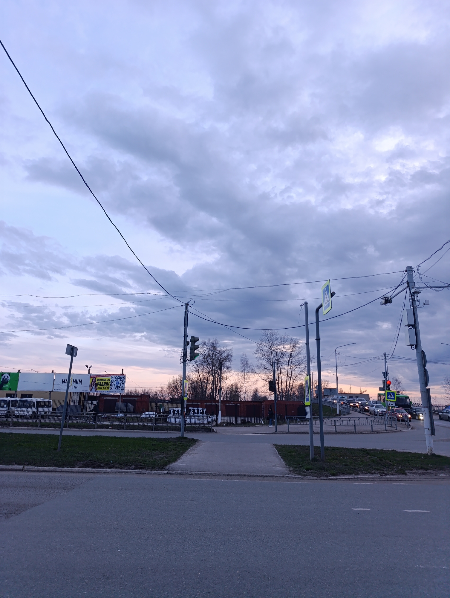 The image depicts a street scene in Chaikovsky, Russia. It is dusk or dawn, indicated by the colors in the sky. The location is a road with a pedestrian crossing. The crossing is marked with signs and…read more
