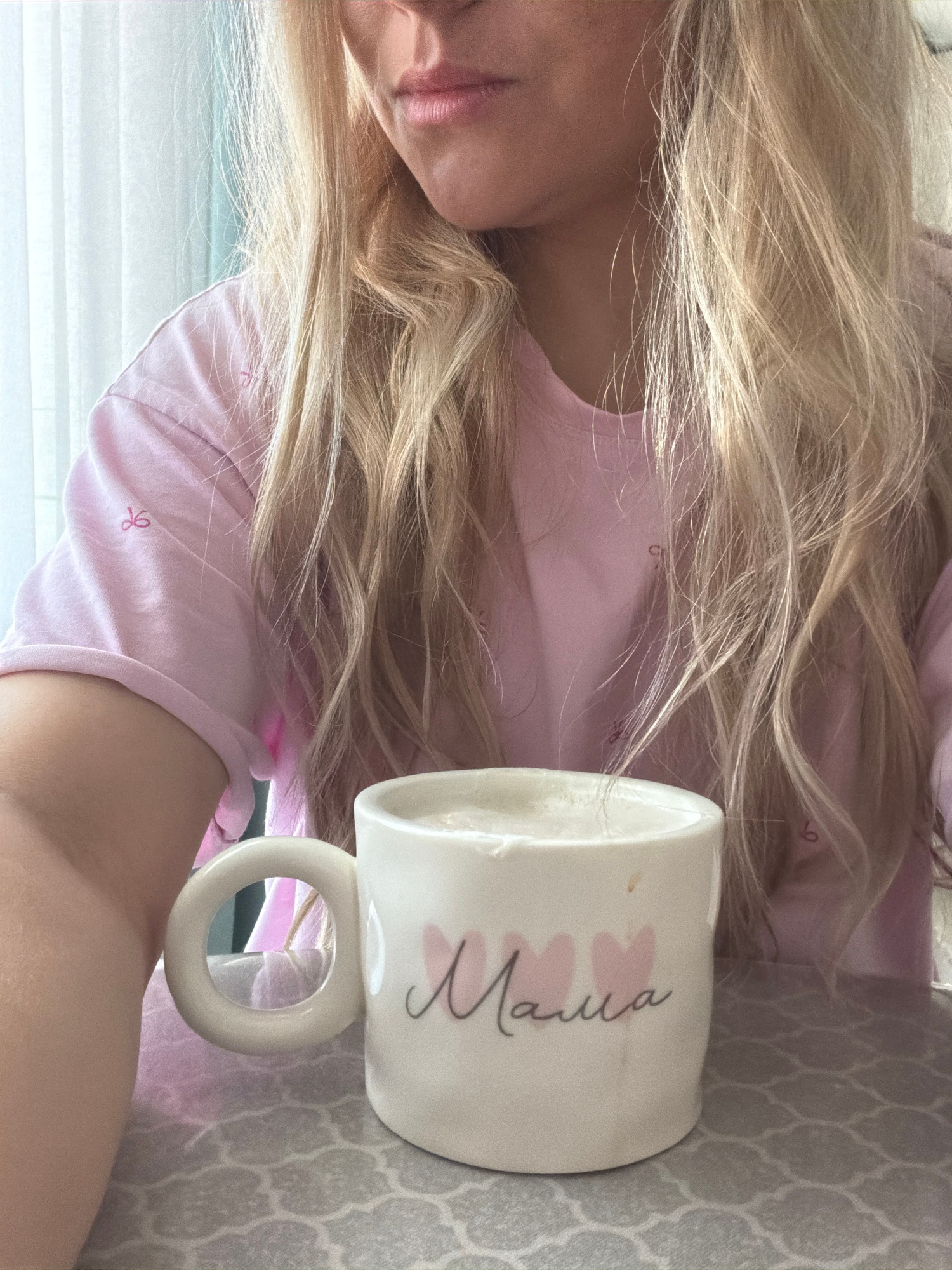 A woman with long blonde hair is lying down, wearing a pink shirt. Next to her on a patterned surface is a white mug with the word "Mama" written on it in a cursive script, accompanied by heart shapes…read more