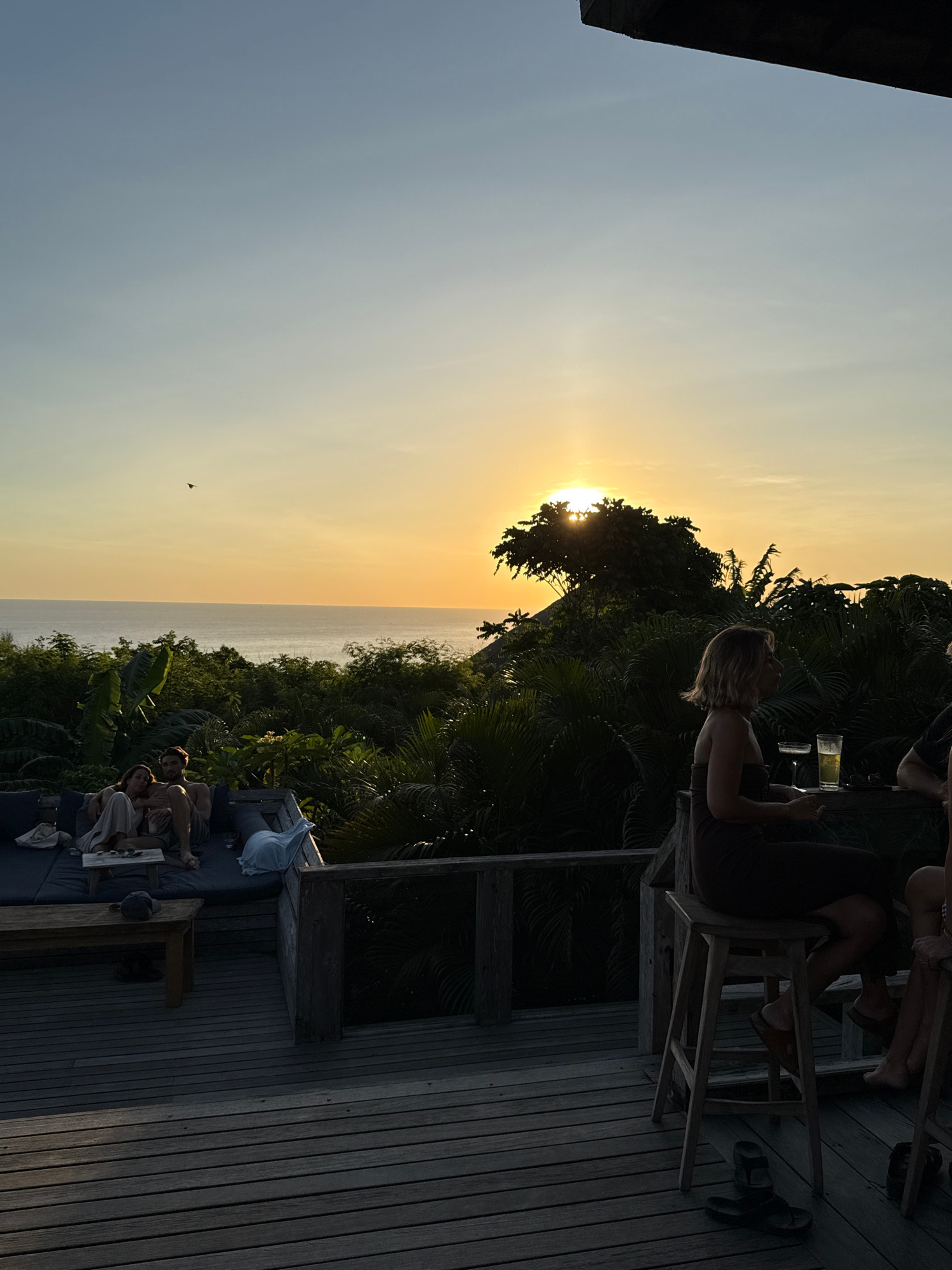 The image depicts a sunset view in Kuta Selatan, Indonesia. The sun is partially obscured by a tree, casting a golden glow over the ocean and sky. A wooden deck is visible, with people seated on chair…read more