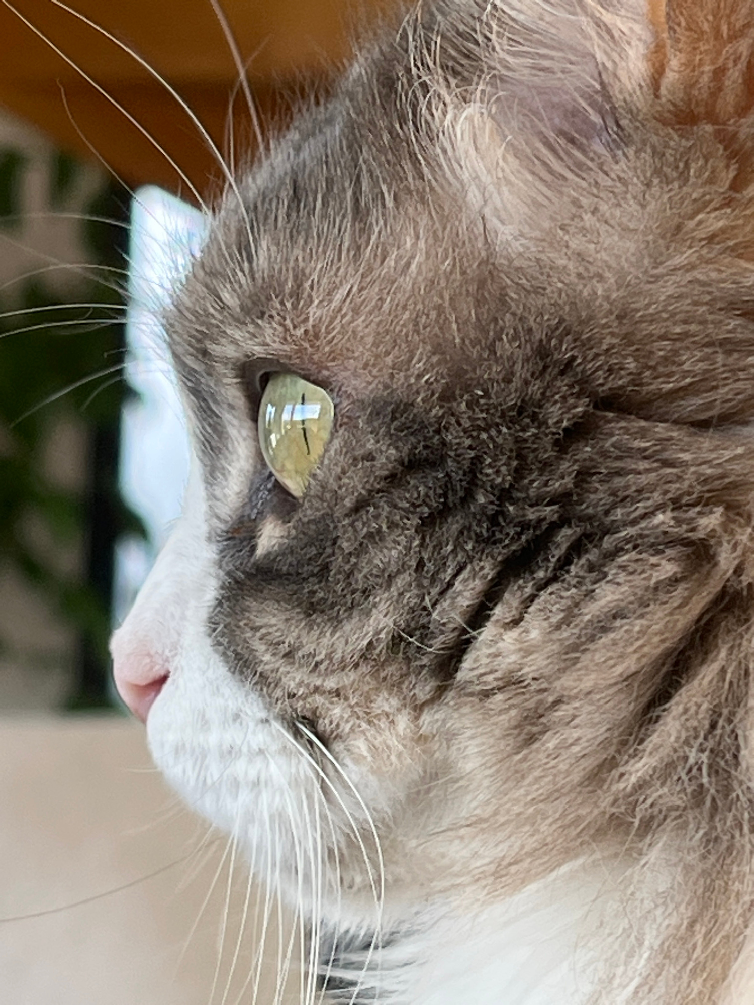 A close-up, slightly angled view of a cat's face. The cat has predominantly grey and brown fur with white fur around its nose and mouth. The cat's eye is visible, showing a yellow-green iris with a ve…read more
