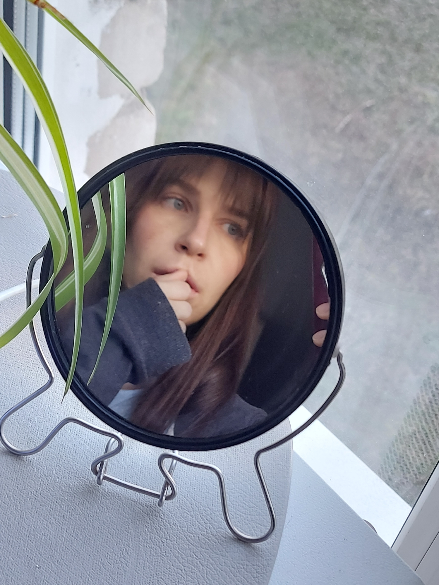 A woman's reflection is seen in a round mirror with a black frame and wire stand. She has light skin, brown hair with bangs, and is wearing a gray sweater. Her hand is raised to her mouth. In the fore…read more