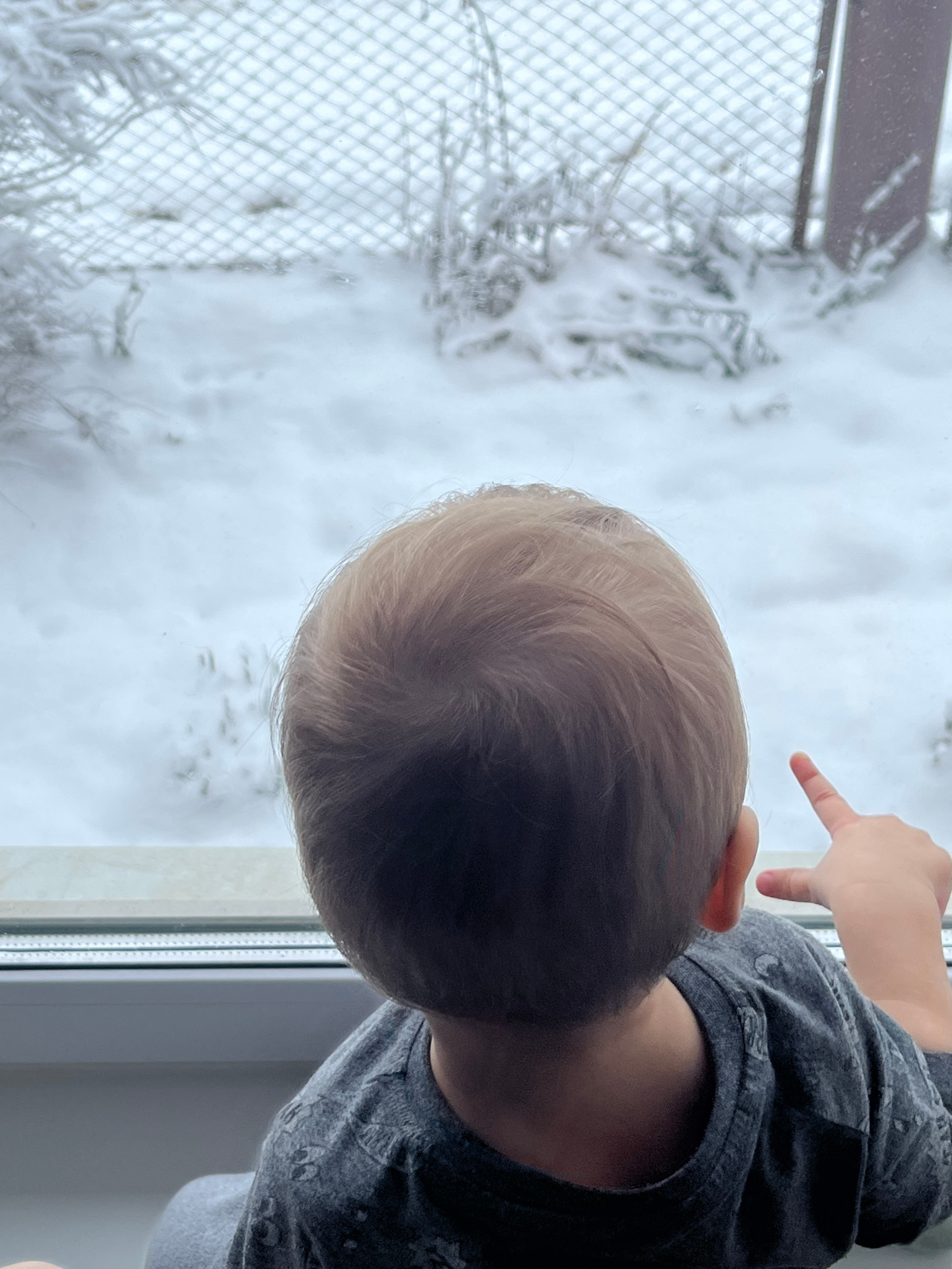 A child with blond hair is looking out a window at a snow-covered scene. The child is wearing a gray shirt and pointing with their right hand. Outside, a chain-link fence is visible in front of a blan…read more