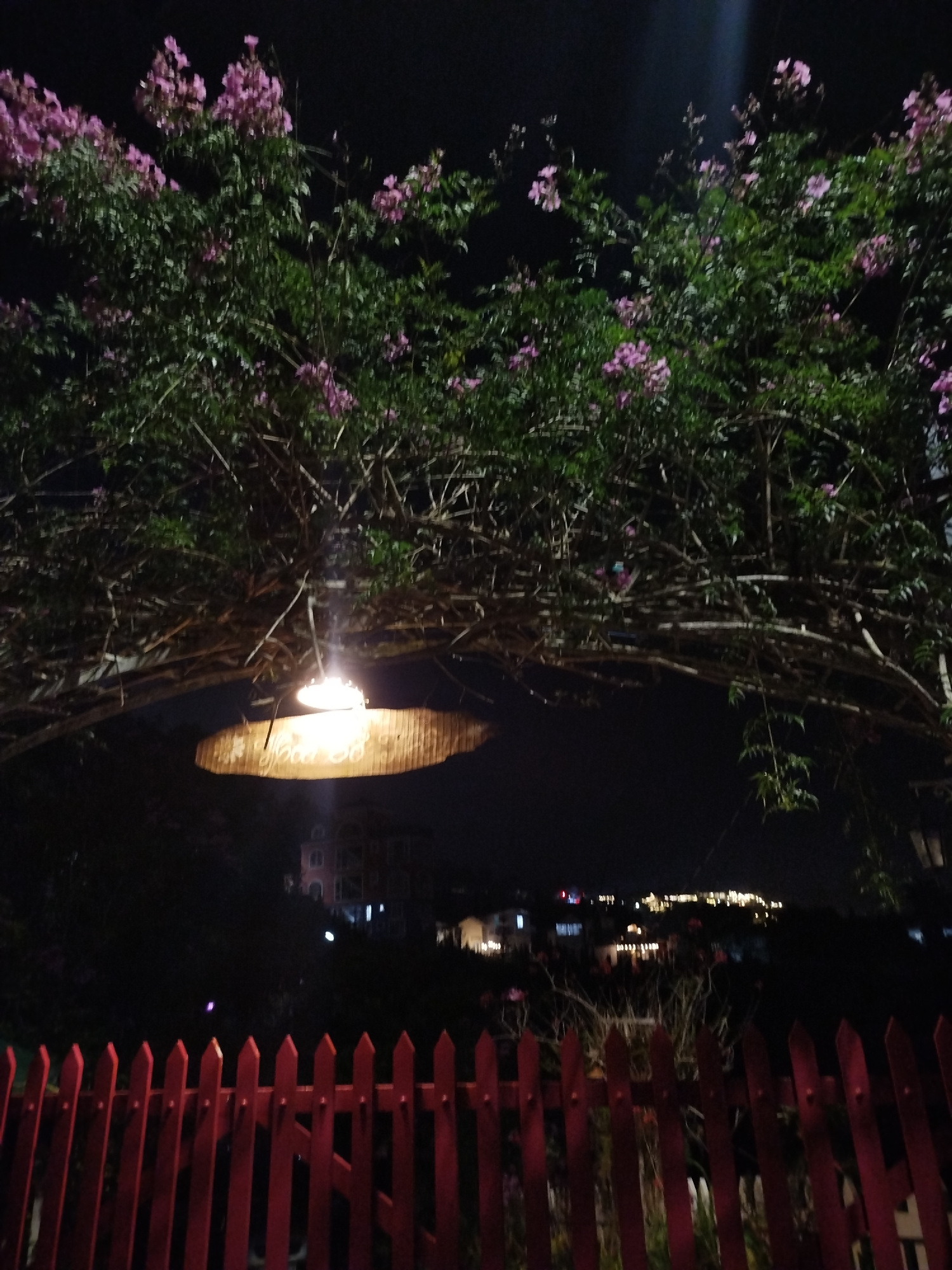 The image shows an outdoor scene at night in Da Lat, Vietnam. A red wooden fence is in the foreground. Behind the fence is a dark landscape with buildings visible in the distance. The buildings are il…read more