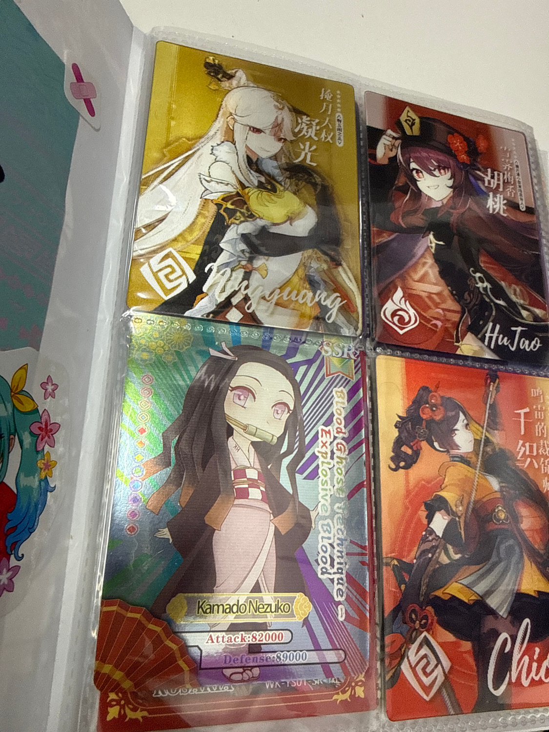 The image displays a close-up view of four trading cards featuring anime characters, presented in clear plastic sleeves within what appears to be a card binder. The cards are arranged in two rows, wit…read more