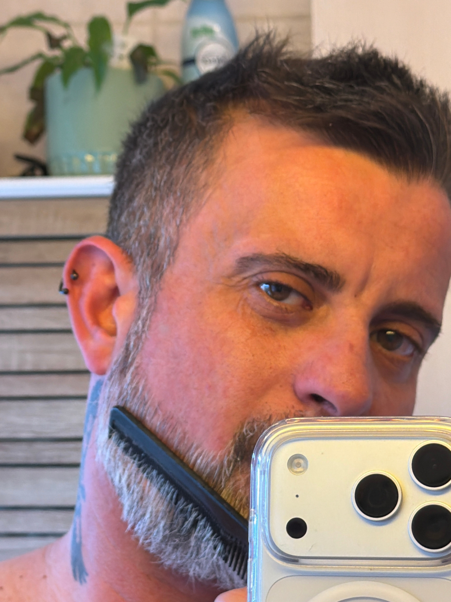 A close-up, vertically oriented selfie shows a man holding a black comb against his graying beard. He is using a smartphone, visible in the upper right corner, presumably to take the photo. The phone…read more