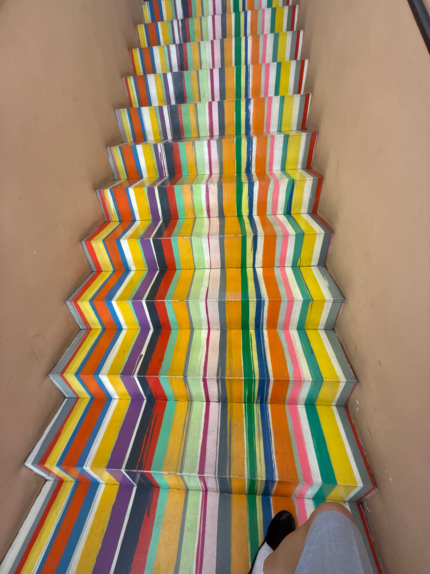 The image shows a zigzag-patterned, colorful wall located in Rome, Italy. The wall features horizontal stripes of various colors, including white, grey, black, purple, red, orange, yellow, green, pink…read more