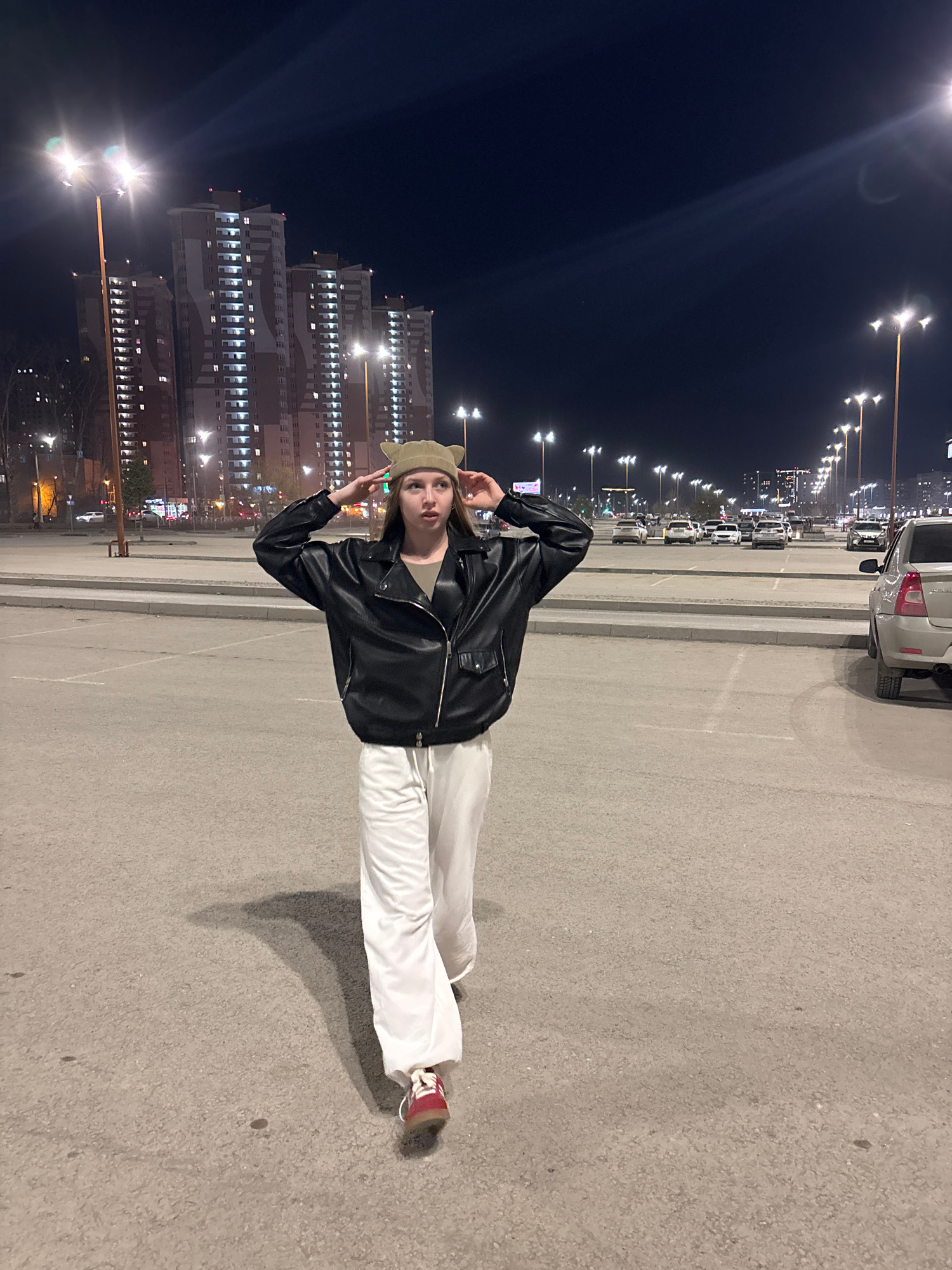 A young woman stands in a parking lot at night in Perm, Russia. She wears a black leather jacket, white pants, and a tan knit cap. She is making a hand gesture near her head. To her left are several t…read more