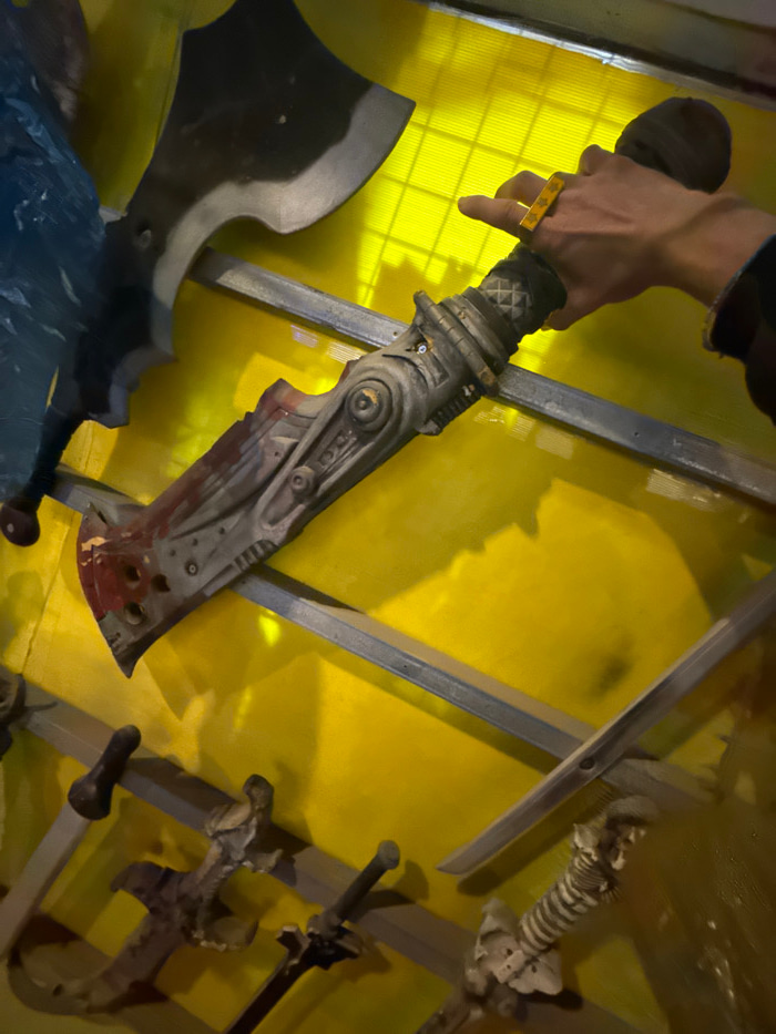 This media file presents an indoor scene located in Tel-Aviv, Israel, showcasing a collection of themed props. The primary focus is a person's right hand and forearm, holding a large, intricately desiβ¦read more