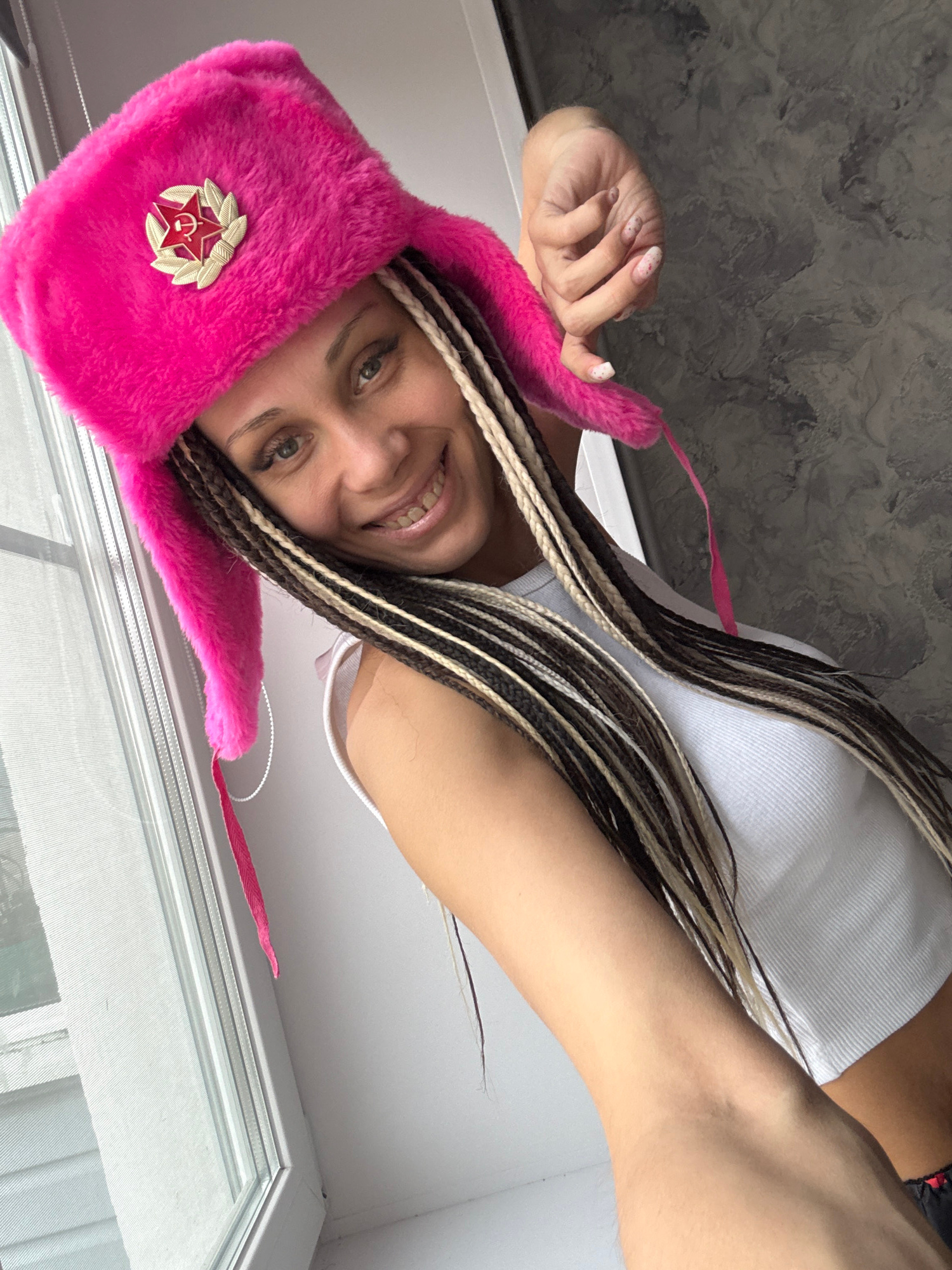 A young woman is photographed from below, wearing a white tank top and a bright pink ushanka hat emblazoned with a Soviet military star. She smiles slightly, her braided hair cascading around the hat…read more