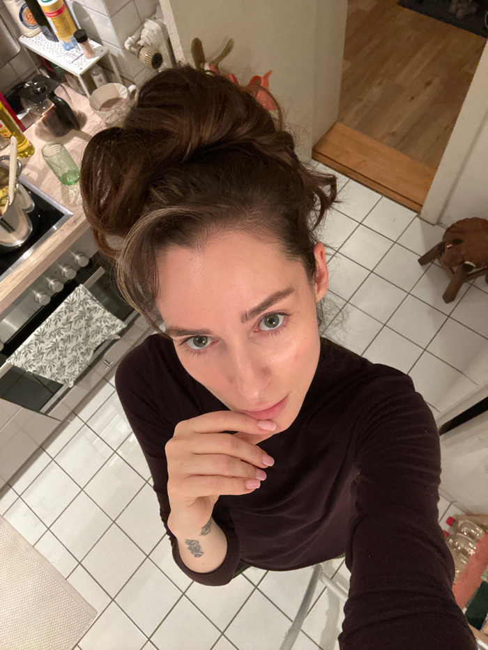 The image depicts a high-angle, vertical shot of a female subject positioned within a domestic kitchen. The subject, a woman with light skin, brown hair styled in a high bun, and green eyes, occupies…read more