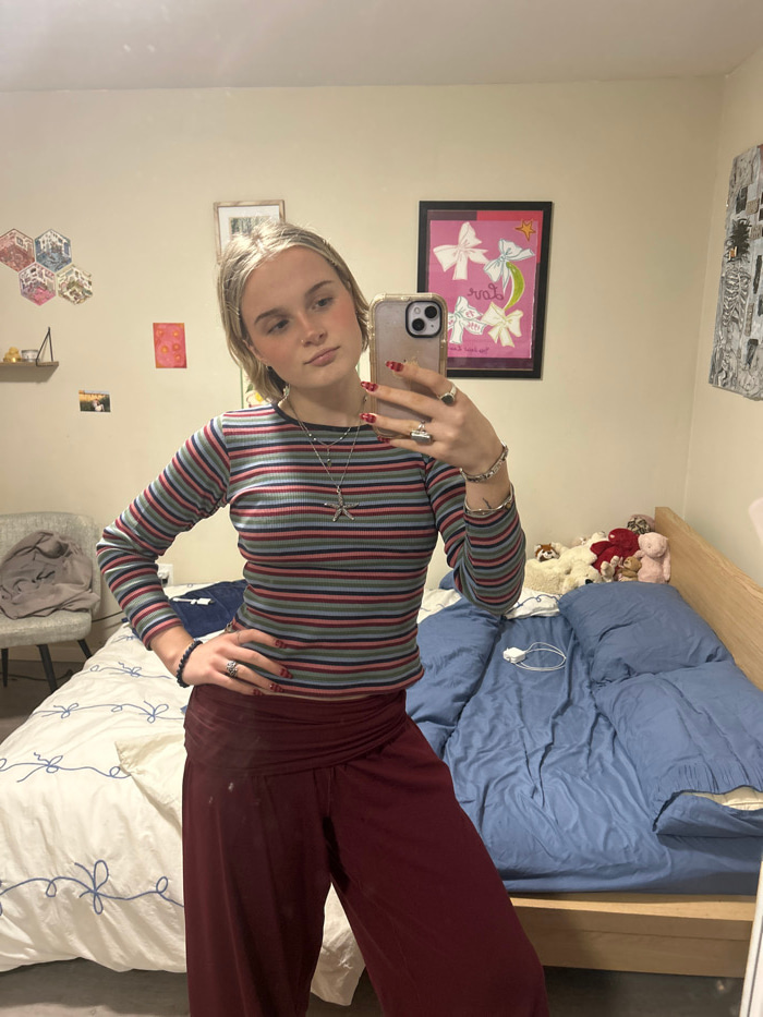 A young woman poses in front of a mirror, holding a phone for a selfie. She wears a striped, long-sleeved top and burgundy pants. Her nails are painted red with dark embellishments. The background revβ¦read more