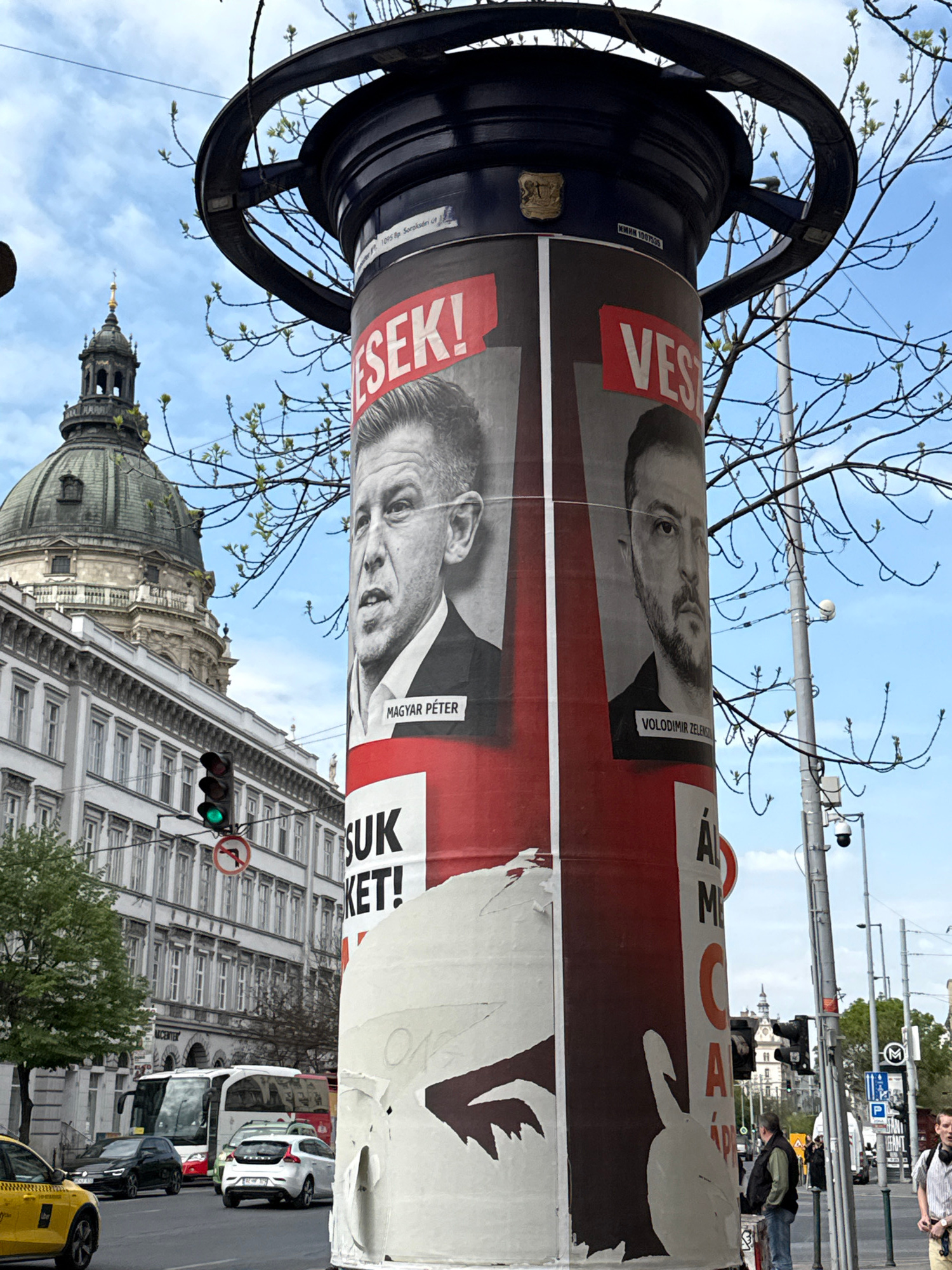 A cylindrical advertising column in Budapest, Hungary, displays political posters featuring Magyar Peter and Volodimir Zelenski. The column is topped with a circular metal structure and positioned amo…read more