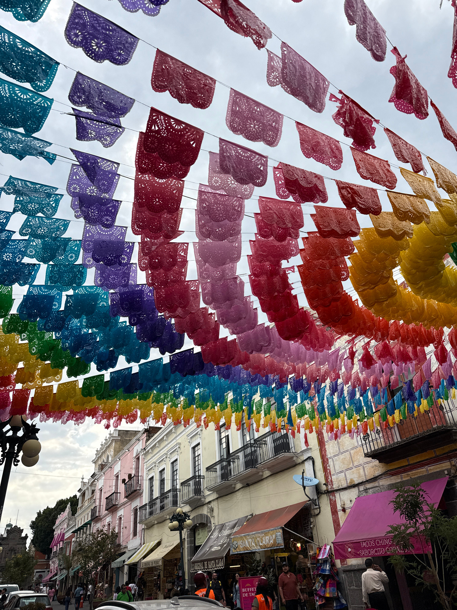 A vibrant street scene in Puebla, Mexico, is captured, looking upwards towards a festive canopy of traditional *papel picado* banners. Hundreds of these intricately cut paper flags, arranged in an arc…read more