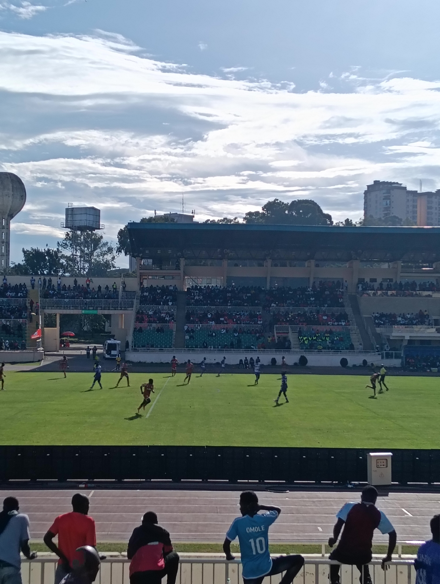 This image captures an outdoor football (soccer) match underway at a stadium in Nairobi, Kenya, during bright daytime with a partly cloudy sky. The main focus is the green football pitch, where numero…read more