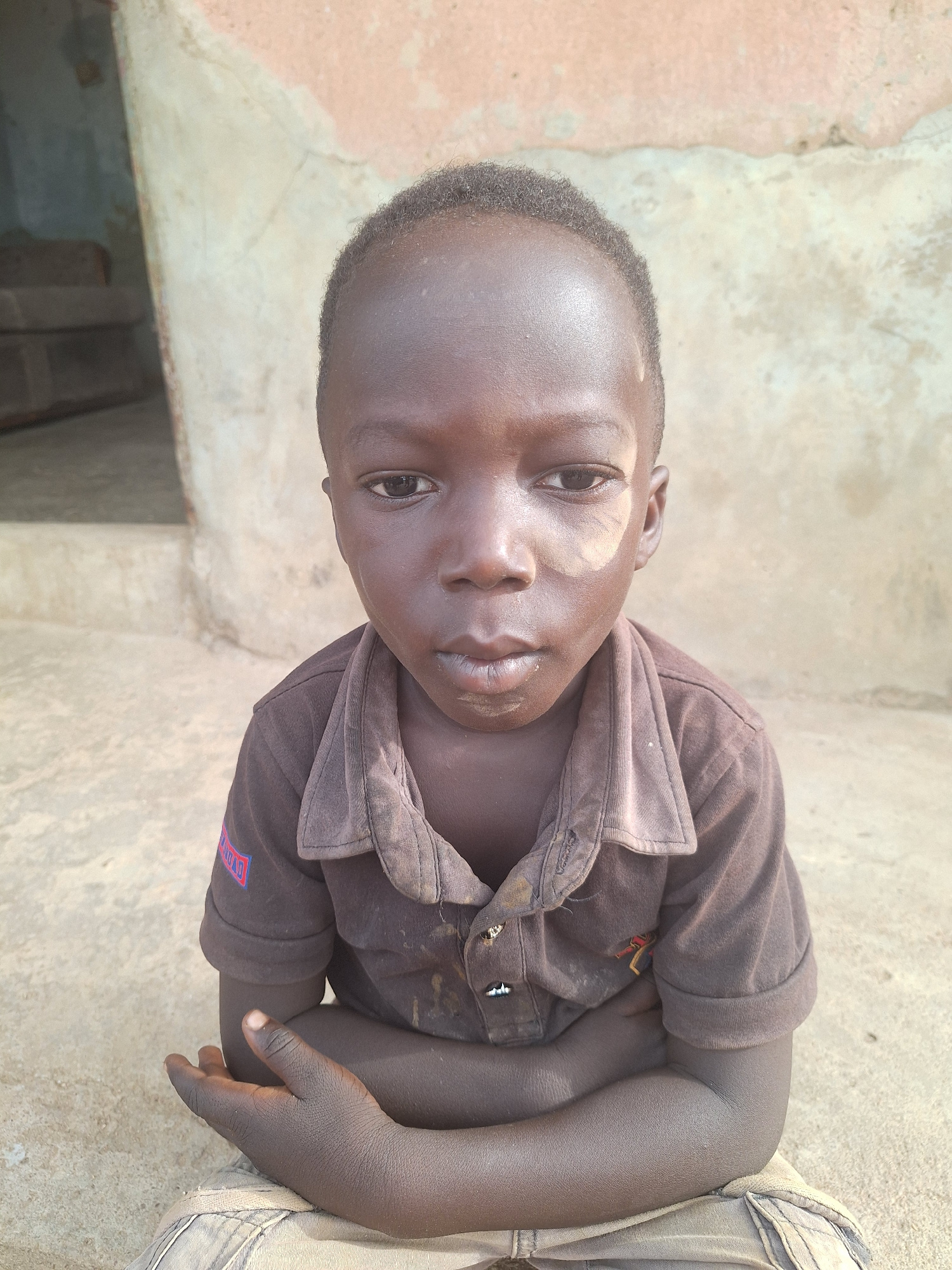 This is a portrait of a young child, likely a boy, with dark skin, captured from the upper chest upwards. The child is looking directly at the camera with a neutral, slightly serious expression. He ha…read more