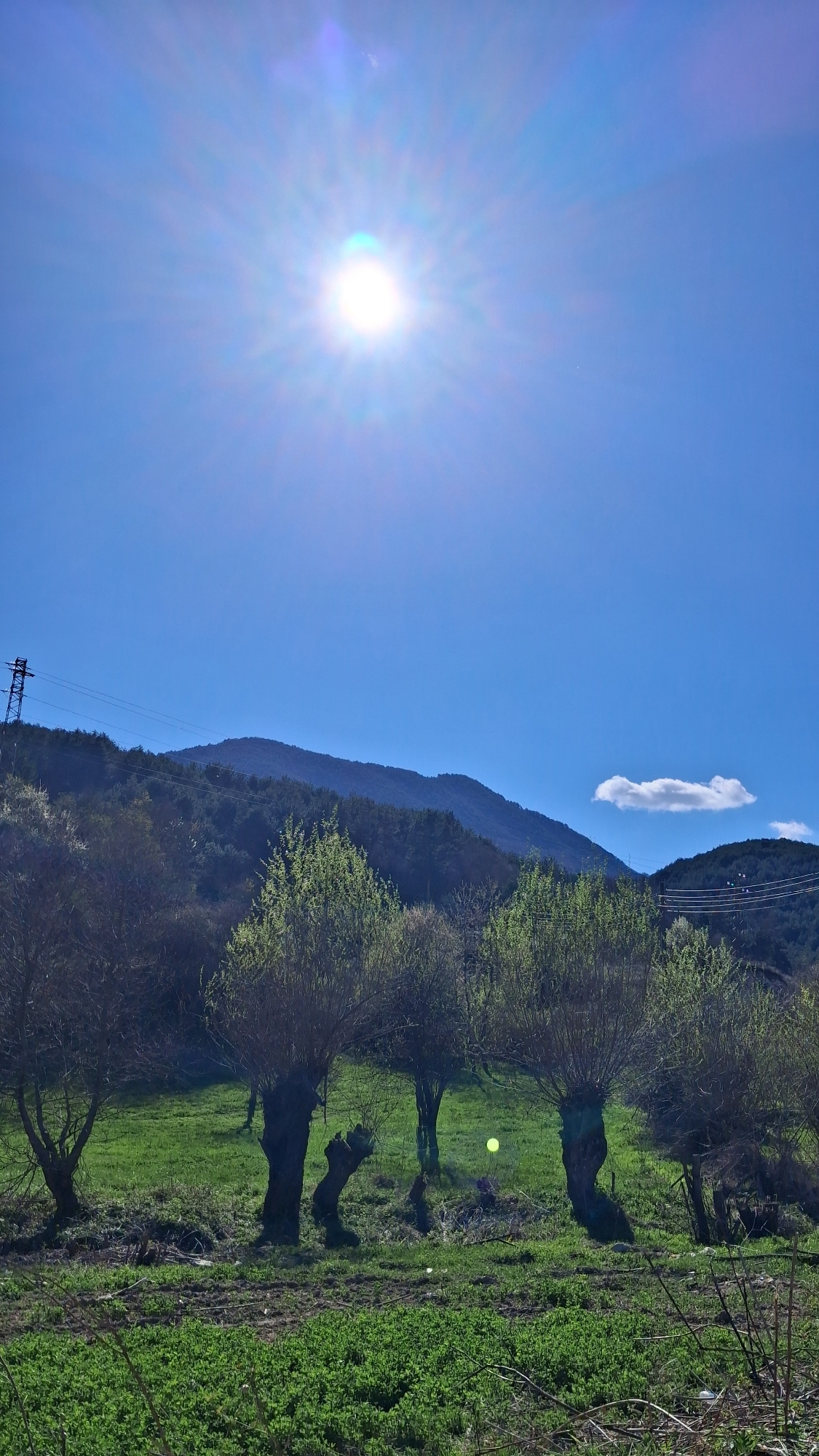 The image shows a landscape in Goce Delcev, Bulgaria, featuring a bright sun in a clear blue sky. A mountain range runs diagonally across the frame, with some trees and vegetation covering the slopes.…read more