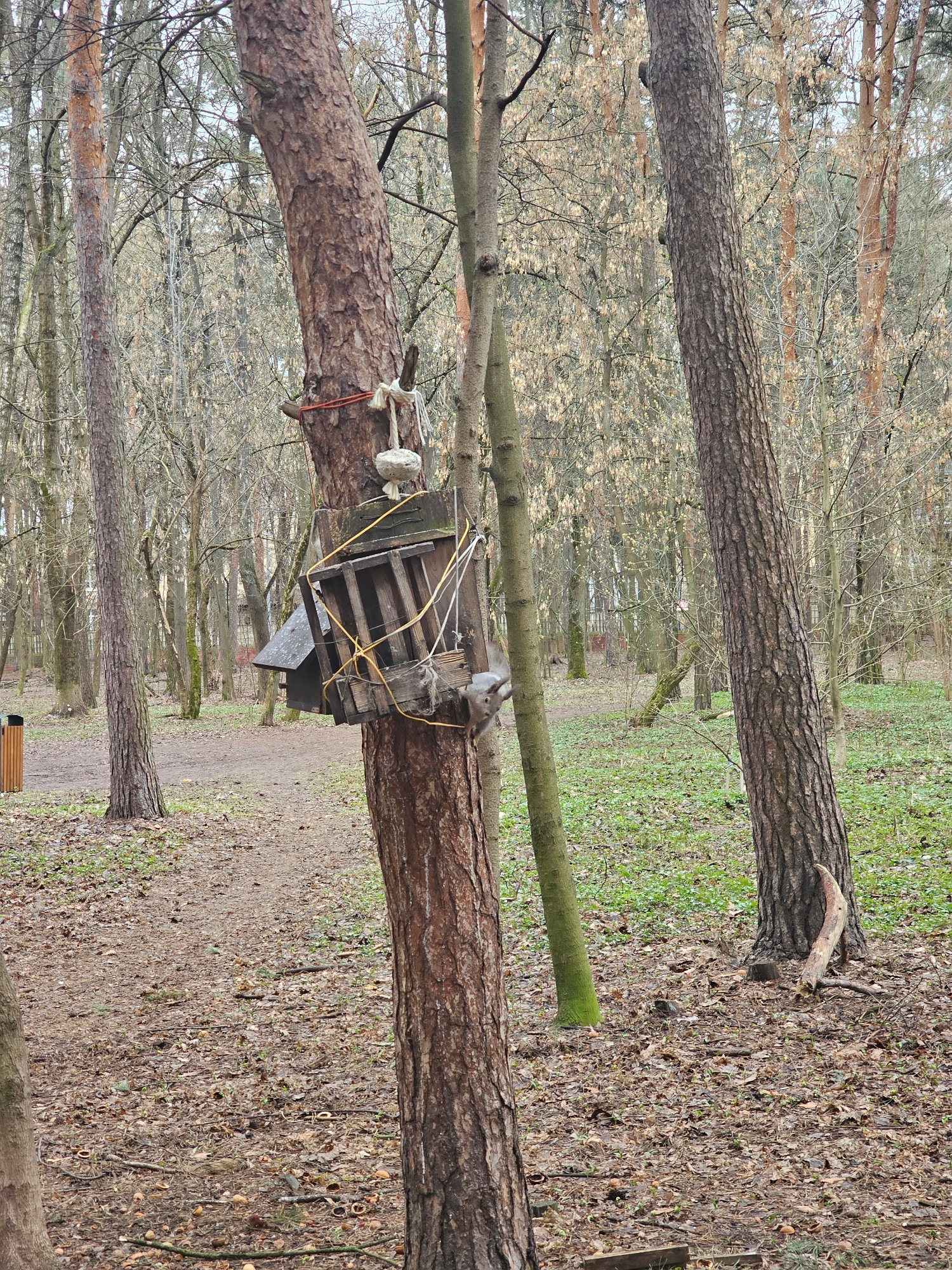 The image depicts a forest scene, likely located in Khimki, Russia, given the prompt's information. Two mature trees stand upright, with a makeshift wooden structure secured between them. The structur…read more
