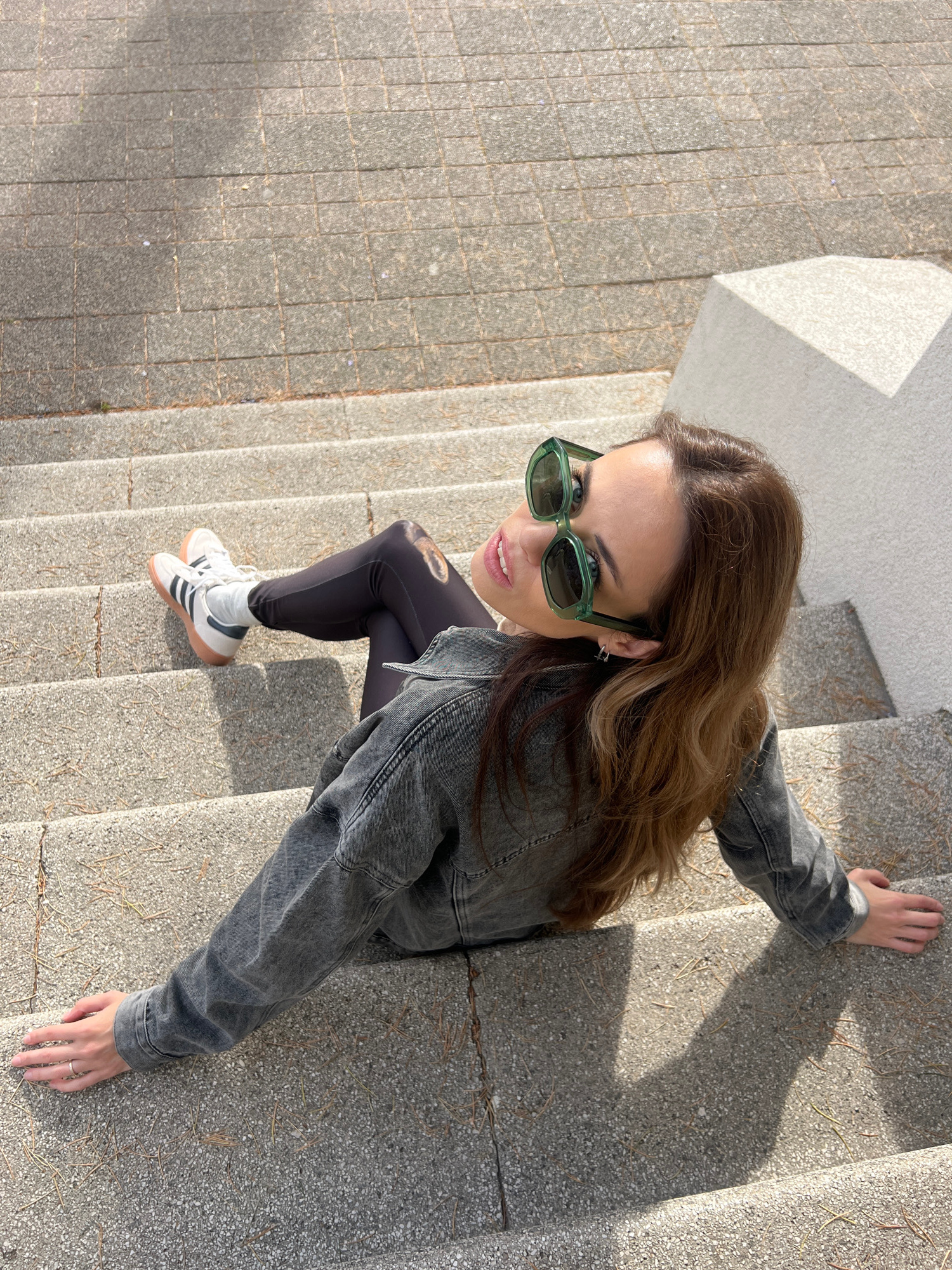 A young woman wearing a gray denim jacket, black leggings, and white Adidas sneakers is sitting on gray concrete steps. She is also wearing green sunglasses. She has shoulder-length brown hair. The st…read more