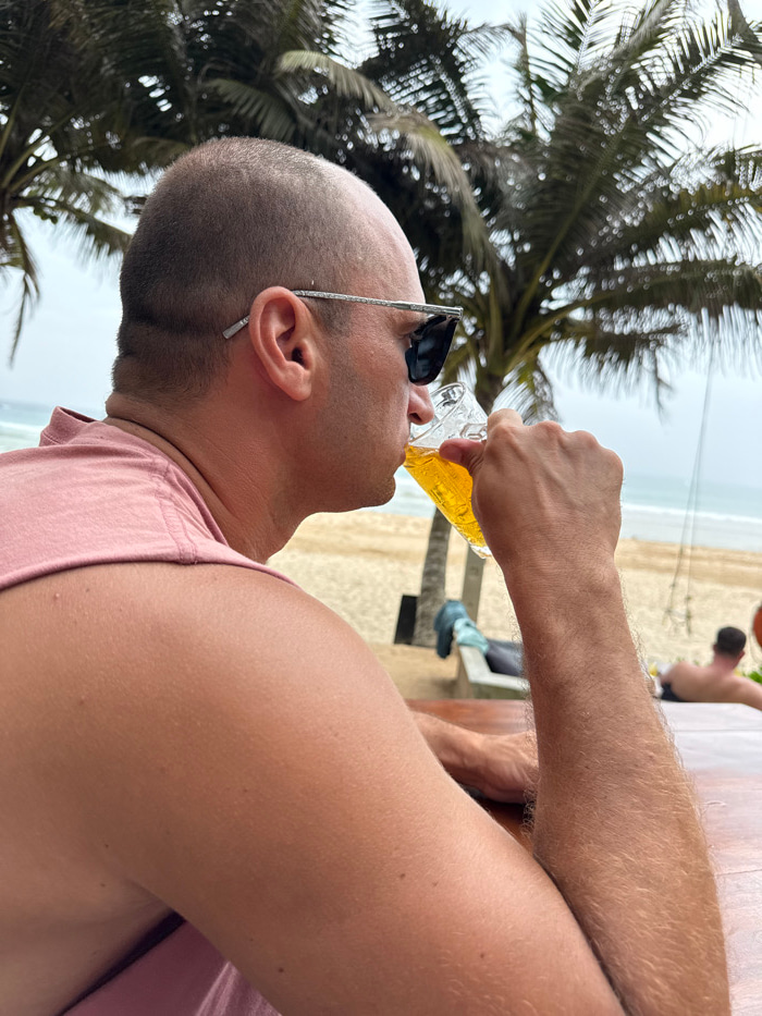 A close-up shot captures a bald man with sunglasses perched on his head, drinking from a glass of beer. He wears a pink shirt. In the background, palm trees frame a beach scene with people visible in…read more