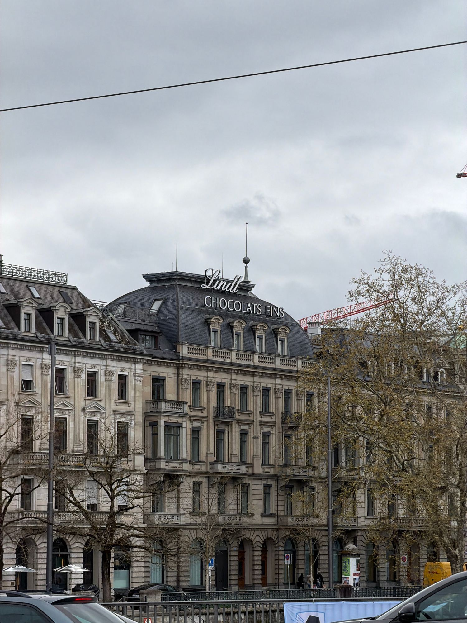 The image shows a multi-story building in Zurich, Switzerland, identified by the "Lindt CHOCOLATS FINS" sign on its roof. The building is made of light-colored stone or concrete, featuring multiple wi…read more