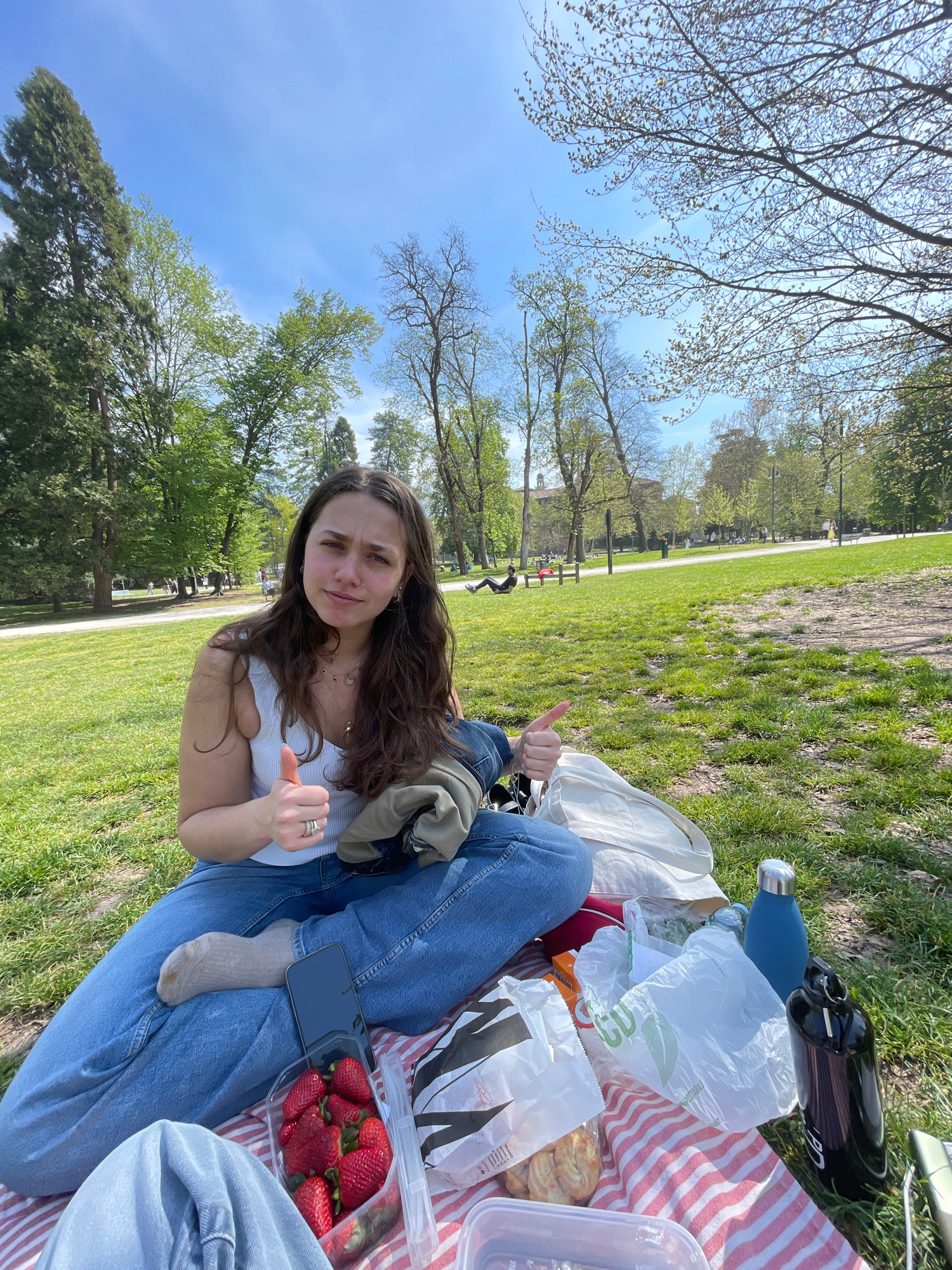 A medium shot depicts a young woman at a picnic in a park, giving a thumbs-up to the camera, with a view of Milan, Italy in the background. The woman, with long brown hair, wears a white tank top and…read more