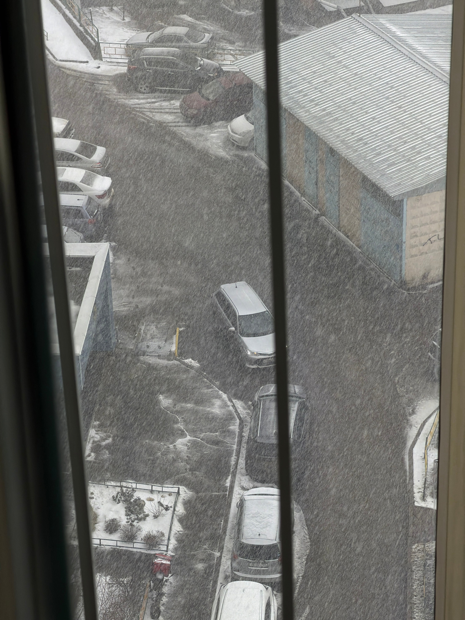 From a high vantage point, likely a window in Krasnoyarsk, Russia, a snowstorm blankets the scene. The view overlooks a parking lot covered in snow, with several cars parked haphazardly, also covered…read more
