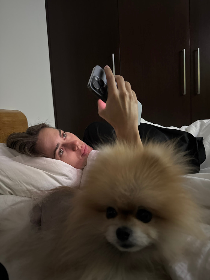 A woman and a fluffy dog lie in bed. The woman is looking at the camera. She holds a smartphone in her left hand. The dog is close to the camera, and its face fills much of the frame. The background f…read more