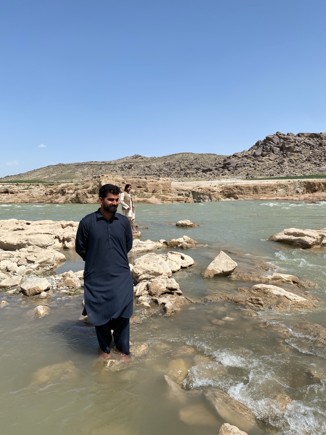 Two men are standing in a river in Abdol Ahadkhan Kariz, Afghanistan. The man in the foreground is wearing a black shalwar kameez and is standing barefoot in the water. The other man in the background…read more