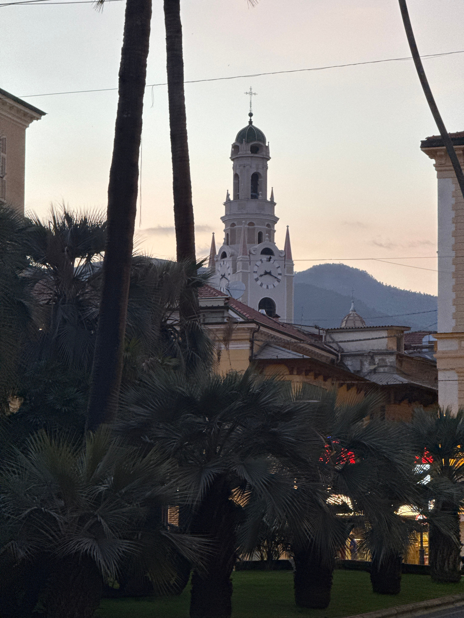 A church steeple is visible, framed by palm trees. The steeple is light-colored, with a clock face and a green dome topped with a cross. A mountain is in the background, silhouetted against the sky. T…read more