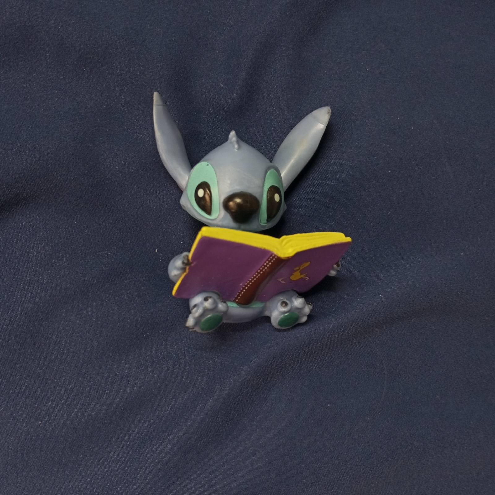 A figurine of Stitch from Disney's "Lilo & Stitch" is positioned on a dark blue fabric surface. The figurine is a light blue and depicts Stitch sitting while holding a book with a purple cover, yellow…read more