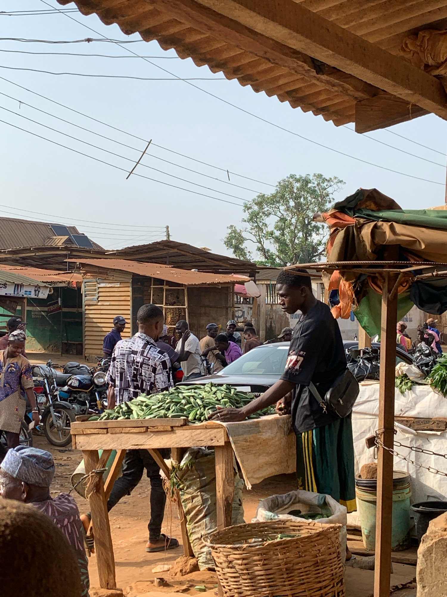 The image depicts a bustling street scene in Ikorodu, Nigeria. A young man in a black t-shirt and shoulder bag is standing near a table piled high with okra, possibly a vendor or customer at a market.…read more