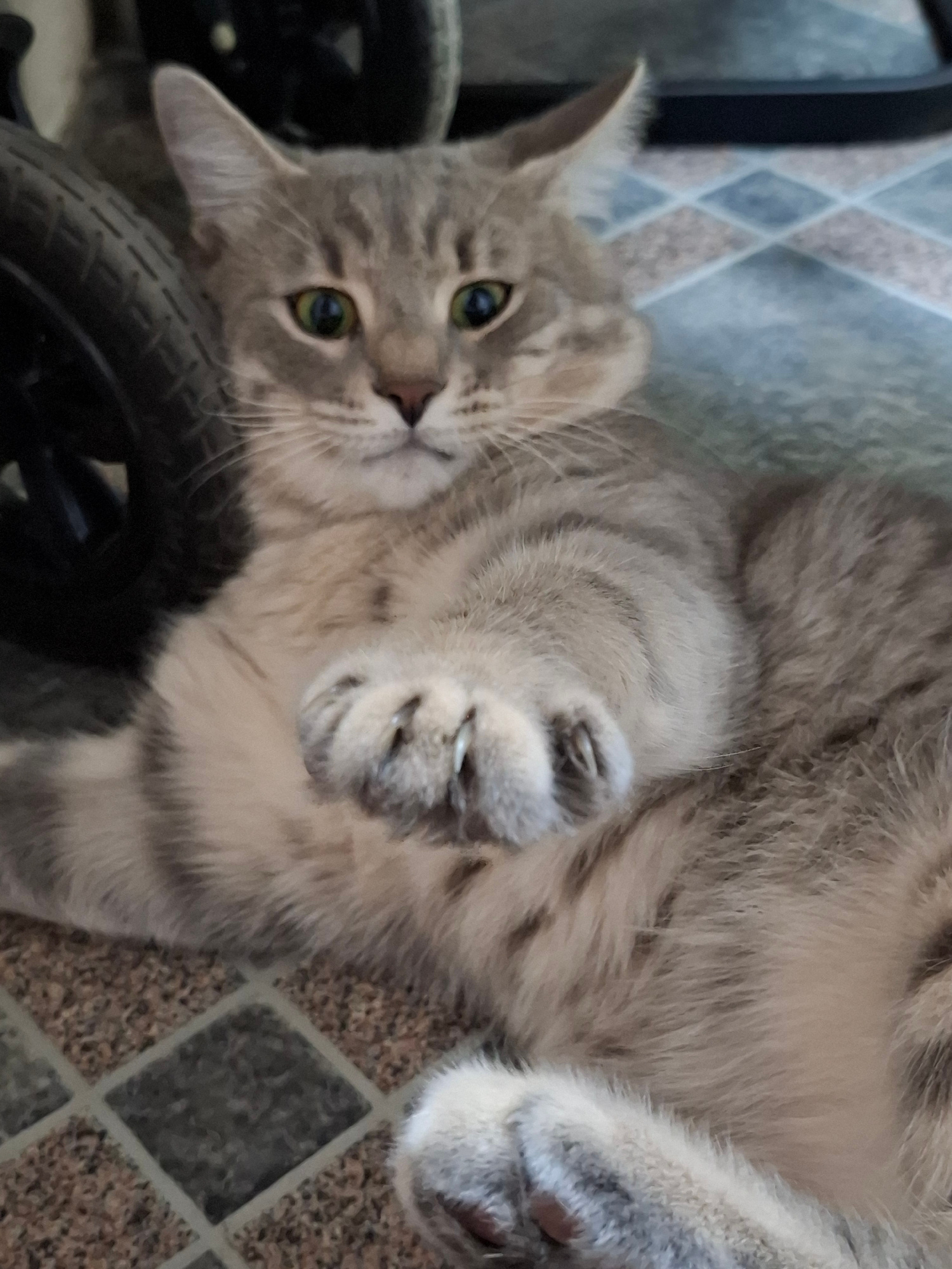 A gray tabby cat lies on its back on a tiled floor, next to a black wheel. The cat's face is visible, with green eyes and a pink nose. Its paws are flexed, exposing its claws. The floor tiles have a d…read more