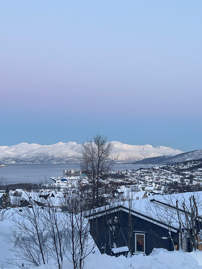 This panoramic photograph depicts a snow-covered winter landscape in Tromsø, Norway, viewed from an elevated position overlooking the city. In the immediate foreground, deep snowdrifts are prominent,…read more