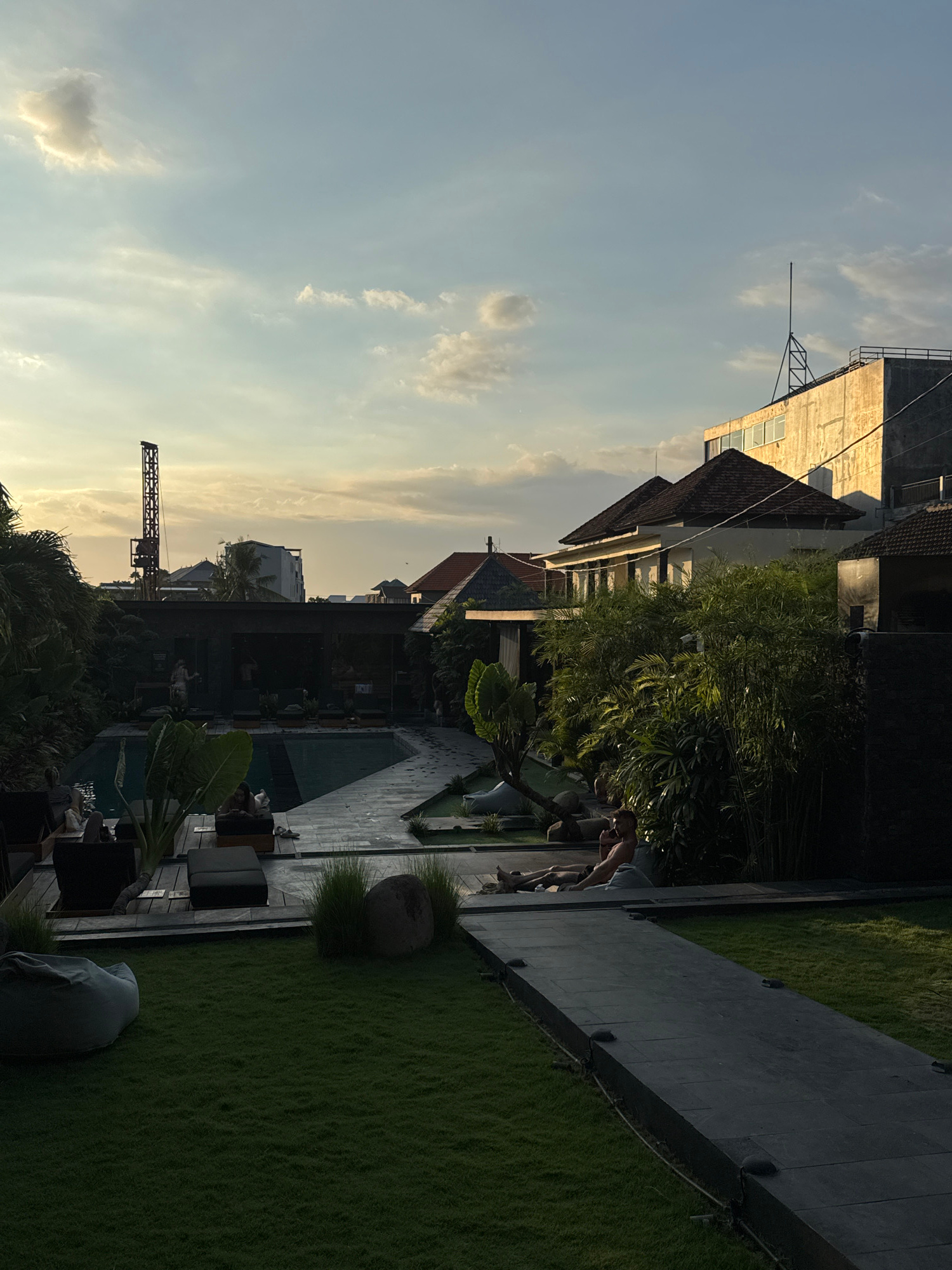 The image shows an outdoor scene, seemingly in Pererenan, Indonesia, at sunset. In the background is a construction crane silhouetted against the sky, along with buildings of varying heights and archi…read more