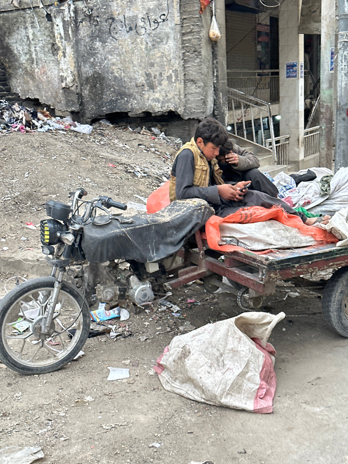 This image depicts an outdoor urban scene in Quetta City Tehsil, Pakistan, characterized by squalor and daily activity. In the foreground, a modified black motorcycle with a cargo trailer attached to…read more