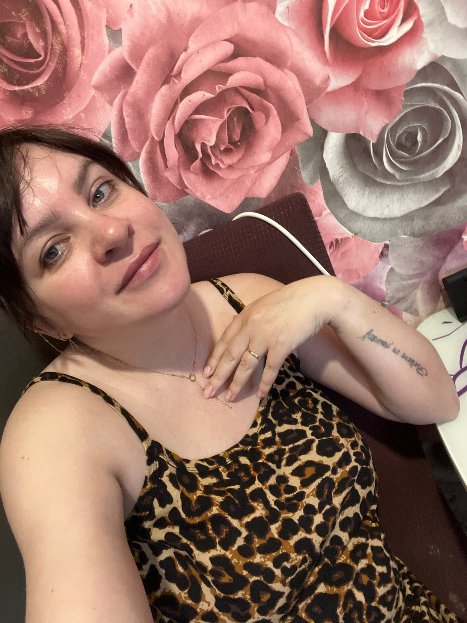 A young adult female lies on a patterned surface, likely fabric or wallpaper, featuring large pink and gray roses. She is wearing a leopard print dress and a gold chain necklace. Her left arm is raise…read more