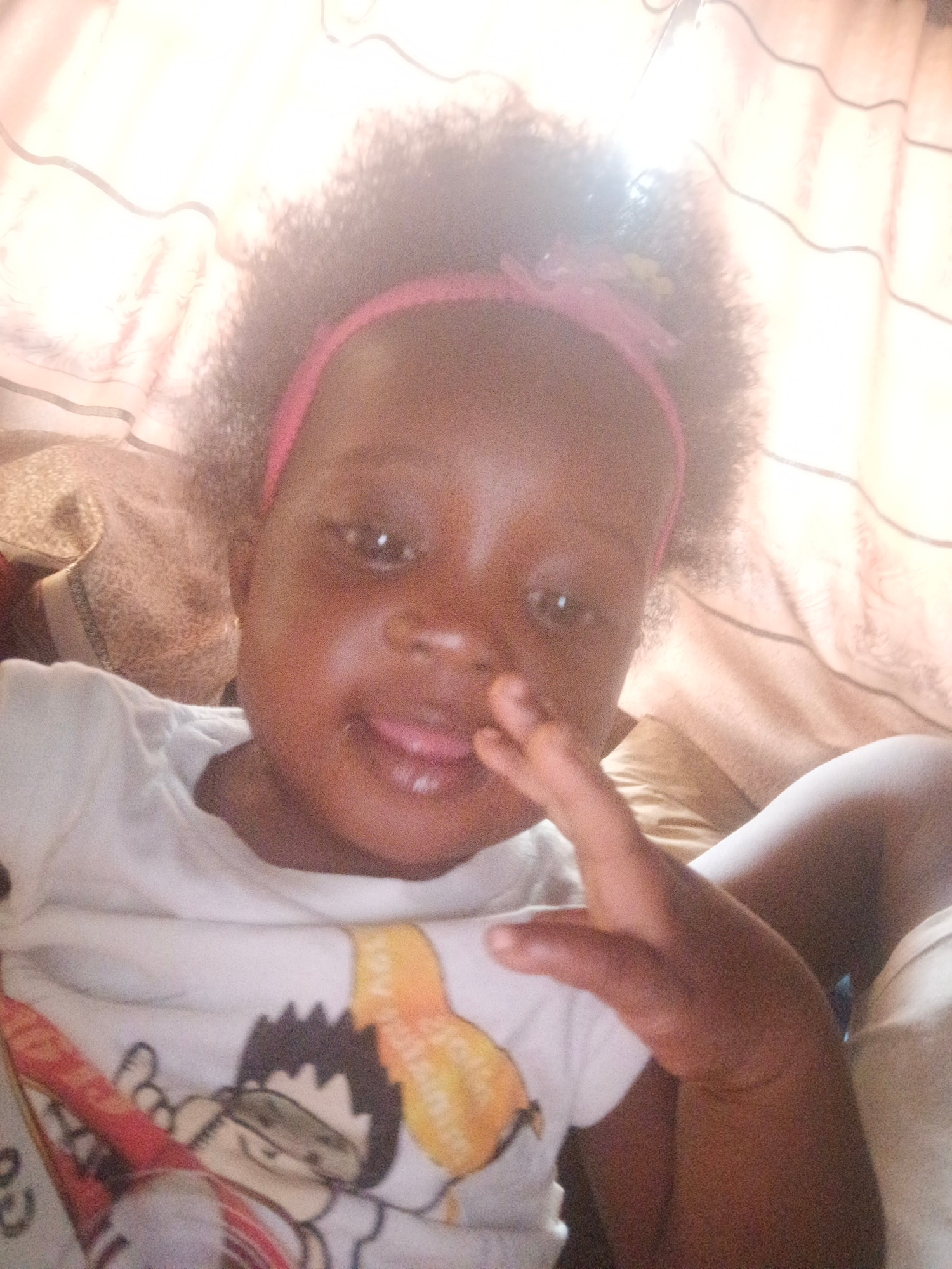 A close-up shot features a young child with dark skin, wearing a pink headband with a floral embellishment. The child is sticking their tongue out slightly and has their right hand raised, fingers par…read more