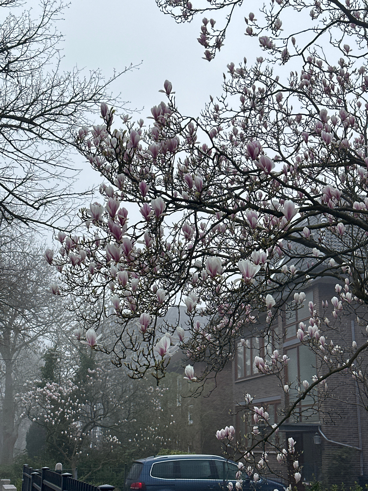 The media file presents a serene outdoor scene, primarily featuring a magnolia tree in full bloom under an overcast sky. The image, though rotated, depicts the magnolia's dark, intricate branches exte…read more