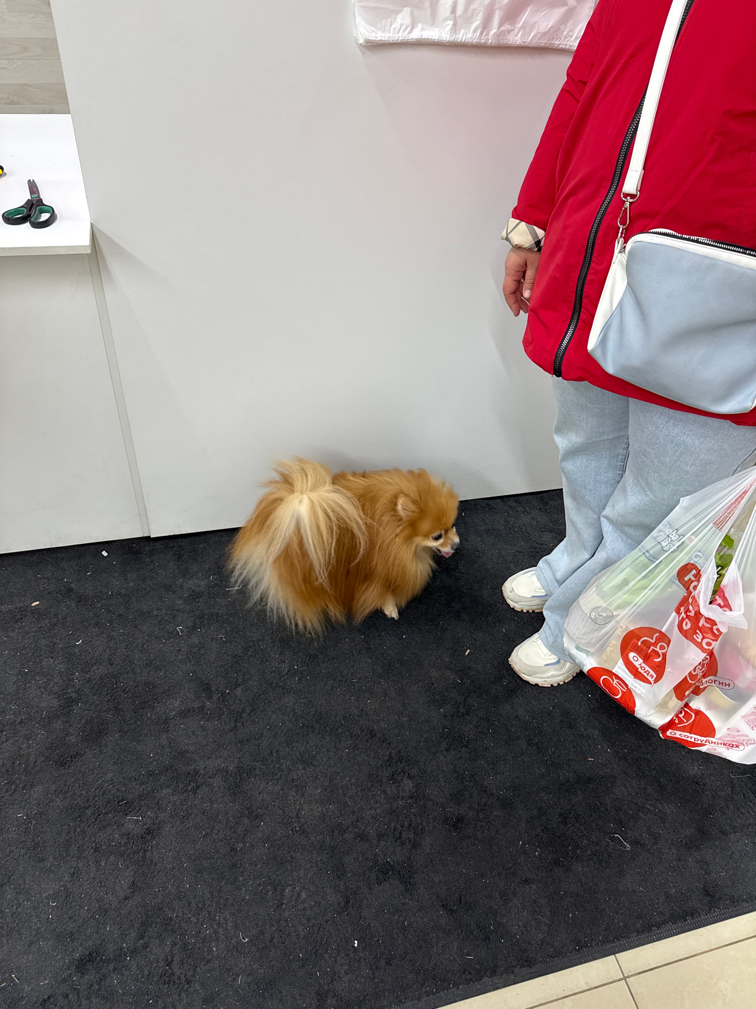 The image is taken from an overhead perspective in what appears to be a commercial space, potentially a store in Moscow, Russia, suggested by the packaging in the shopping bag. The scene is divided by…read more