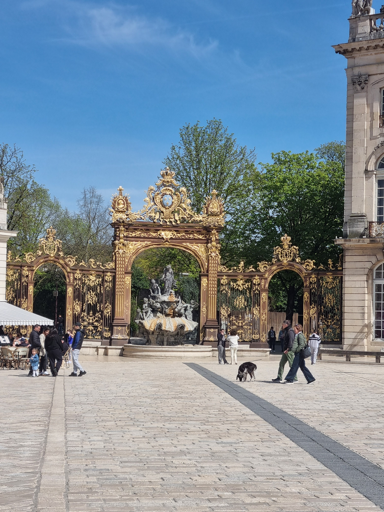 The image captures the Golden Gate of Place Stanislas in Nancy, France, on a bright, sunny day. The ornate, gilded ironwork of the gate is prominently featured against a clear blue sky and verdant treβ¦read more