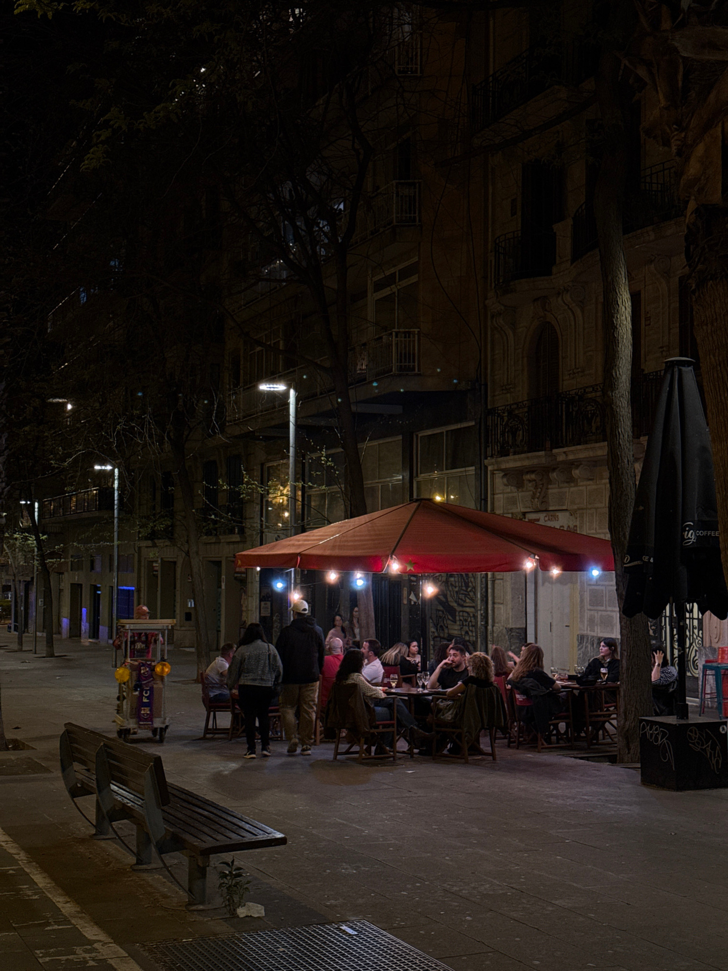 The image shows a street scene in Barcelona, Spain, at night. A group of people are seated at outdoor tables under a red awning decorated with string lights. Some are eating and drinking, while othersβ¦read more