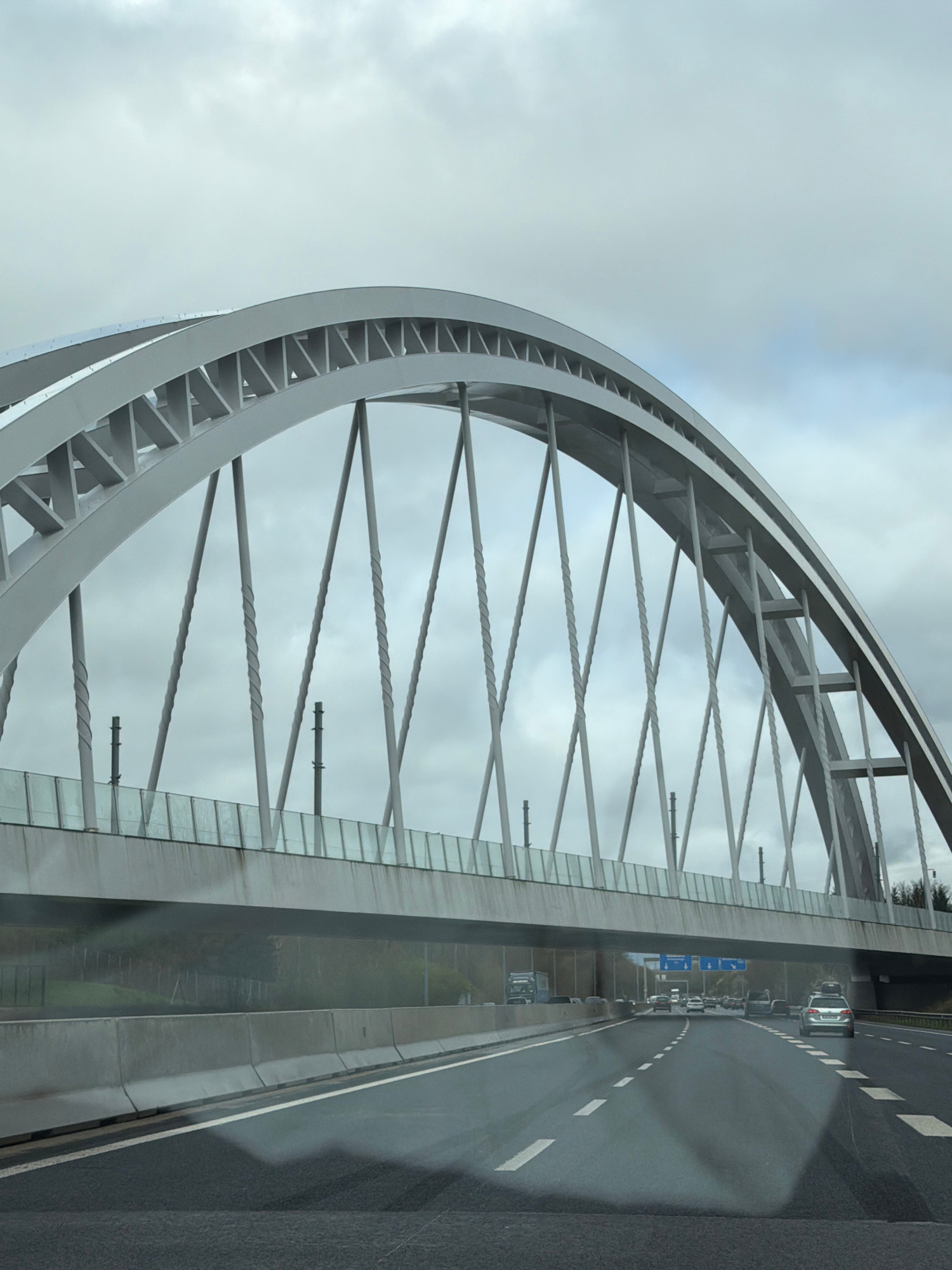 The image captures a view of the Passerelle Rouge, a striking steel arch bridge spanning the A3 motorway in Hesperange, Luxembourg. The arch of the bridge dominates the left side of the frame, showcas…read more