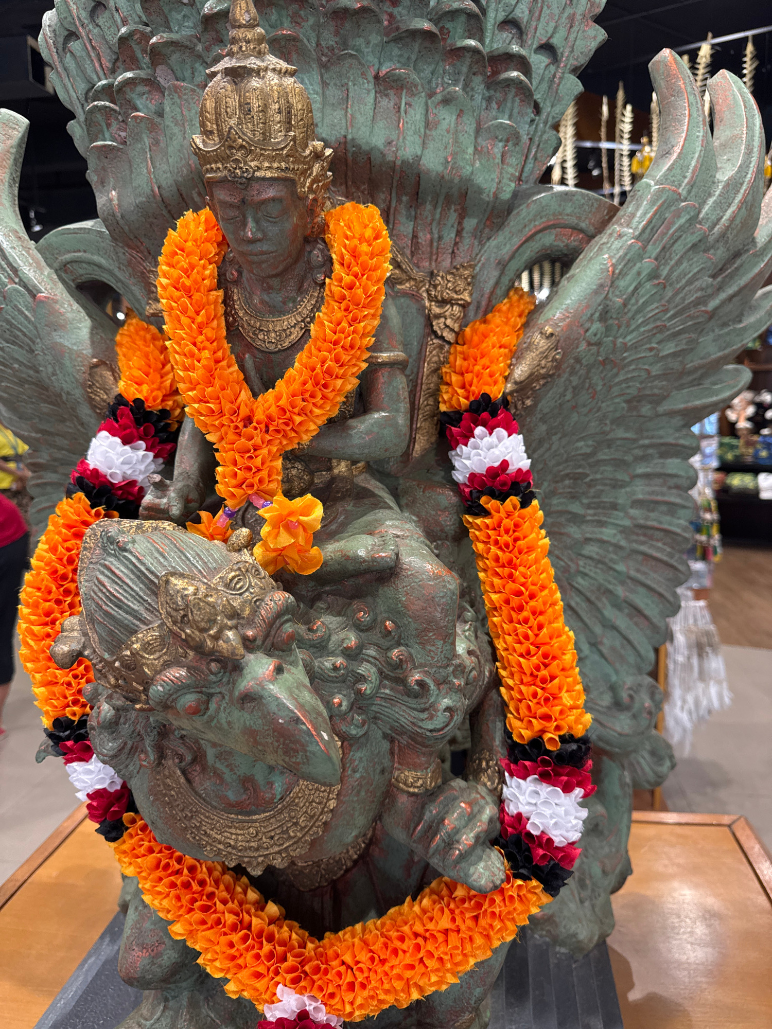 A statue with wings is adorned with an orange and black-white-red flower garland. The statue appears to be made of bronze and has a greenish patina. The location is Kuta Selatan, Indonesia.